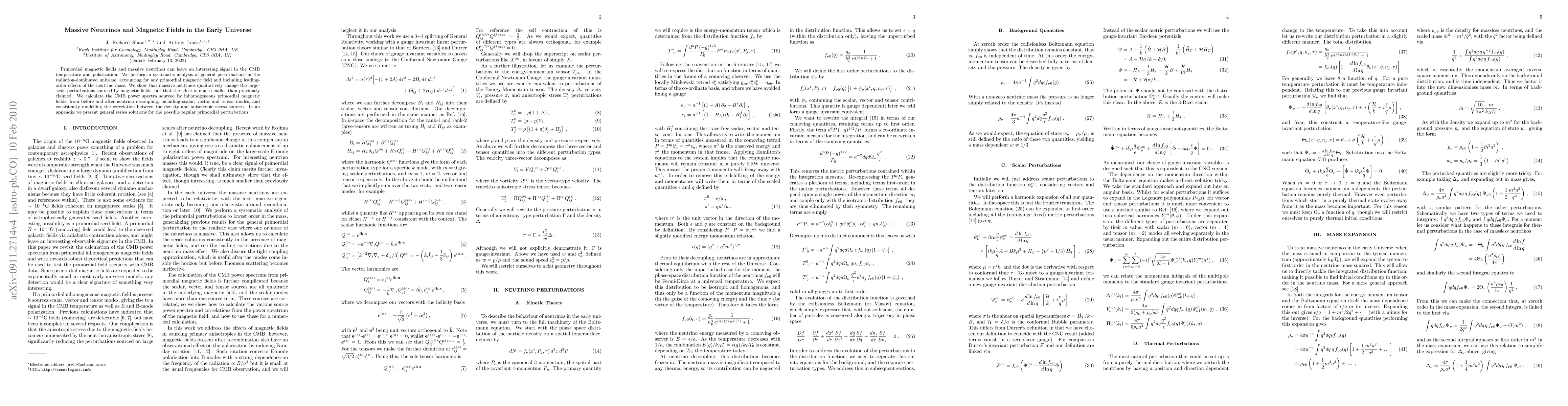 This paper investigates the impact of primordial magnetic fields and massive neutrinos on the Cosmic Microwave Background (CMB) in the early universe, finding that while massive neutrinos alter large-scale perturbations from magnetic fields, their effect is smaller than previously thought. The study systematically analyzes general perturbations and calculates CMB power spectra, including scalar, vector, and tensor modes.