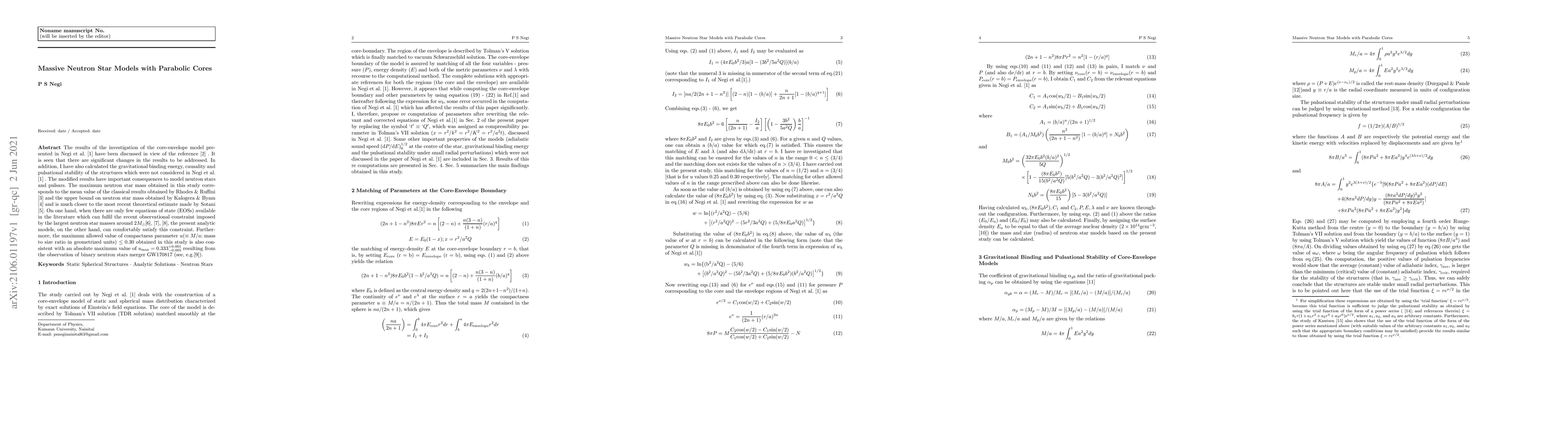 The results of the investigation of the core-envelope model presented in Negi et al. \cite{Ref1} have been discussed in view of the reference \cite{Ref2} . It is seen that there are significant changes in the results to be addressed. In addition, I have also calculated the gravitational binding energy, causality and pulsational stability of the structures which were not considered in Negi et al. \cite{Ref1} . The modified results have important consequences to model neutron stars and pulsars. The maximum neutron star mass obtained in this study corresponds to the mean value of the classical results obtained by Rhodes \& Ruffini \cite {Ref3} and the upper bound on neutron star mass obtained by Kalogera \& Byam \cite {Ref4} and is much closer to the most recent theoretical estimate made by Sotani \cite{Ref5}. On one hand, when there are only few equations of state (EOSs) available in the literature which can fulfil the recent observational constraint imposed by the largest neutron star masses around 2$M_\odot$\cite{Ref6}, \cite{Ref7}, \cite{Ref8}, the present analytic models, on the other hand, can comfortably satisfy this constraint. Furthermore, the maximum allowed value of compactness parameter $u(\equiv M/a$; mass to size ratio in geometrized units) $ \leq 0.30$ obtained in this study is also consistent with an absolute maximum value of $ u_{\rm max} = 0.333^{+0.001}_{-0.005}$ resulting from the observation of binary neutron stars merger GW170817 (see, e.g.\cite{Ref9}).