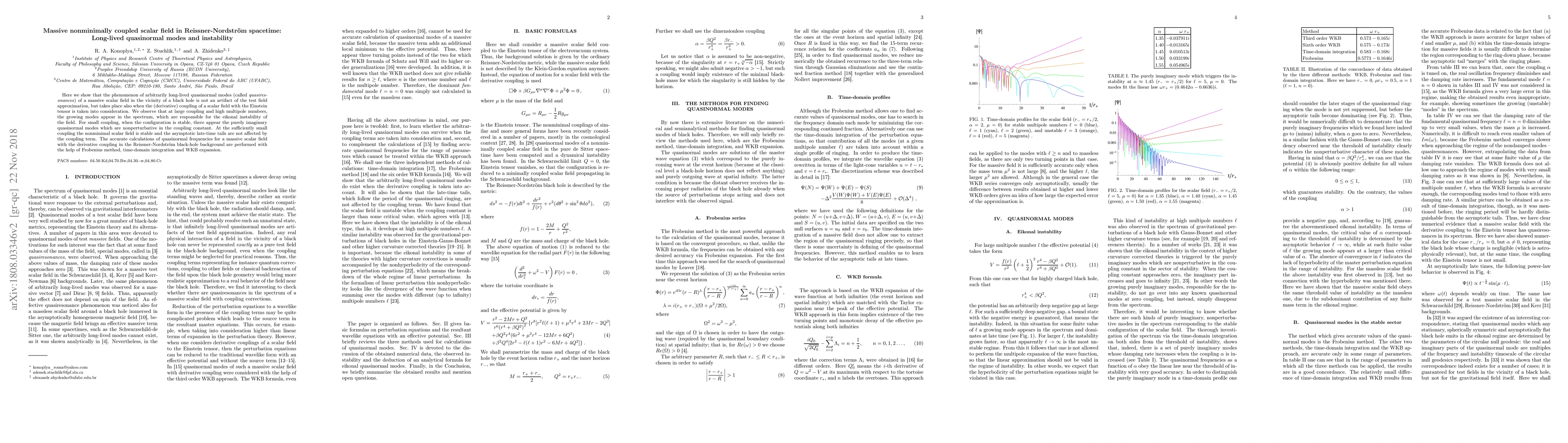 Here we show that the phenomenon of arbitrarily long-lived quasinormal modes (called quasiresonances) of a massive scalar field in the vicinity of a black hole is not an artifact of the test field approximation, but takes place also when the (derivative) coupling of a scalar field with the Einstein tensor is taken into consideration. We observe that at large coupling and high multipole numbers, the growing modes appear in the spectrum, which are responsible for the eikonal instability of the field. For small coupling, when the configuration is stable, there appear the purely imaginary quasinormal modes which are nonperturbative in the coupling constant. At the sufficiently small coupling the nonminimal scalar field is stable and the asymptotic late-time tails are not affected by the coupling term. The accurate calculations of quasinormal frequencies for a massive scalar field with the derivative coupling in the Reissner-Nordstr\"om black-hole background are performed with the help of Frobenius method, time-domain integration and WKB expansion.