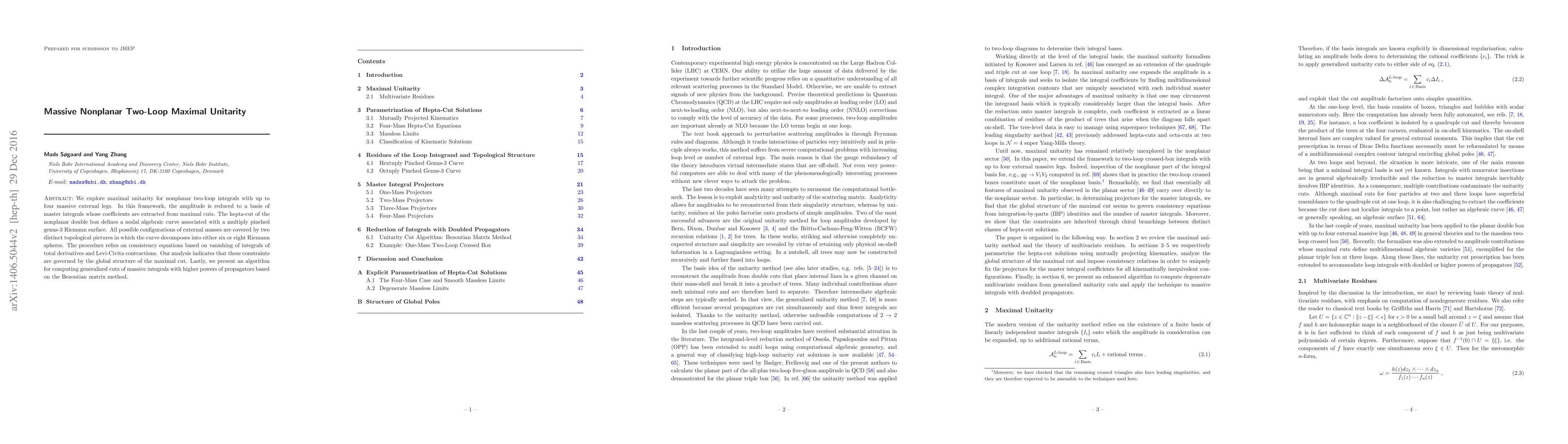 We explore maximal unitarity for nonplanar two-loop integrals with up to four massive external legs. In this framework, the amplitude is reduced to a basis of master integrals whose coefficients are extracted from maximal cuts. The hepta-cut of the nonplanar double box defines a nodal algebraic curve associated with a multiply pinched genus-3 Riemann surface. All possible configurations of external masses are covered by two distinct topological pictures in which the curve decomposes into either six or eight Riemann spheres. The procedure relies on consistency equations based on vanishing of integrals of total derivatives and Levi-Civita contractions. Our analysis indicates that these constraints are governed by the global structure of the maximal cut. Lastly, we present an algorithm for computing generalized cuts of massive integrals with higher powers of propagators based on the Bezoutian matrix method.