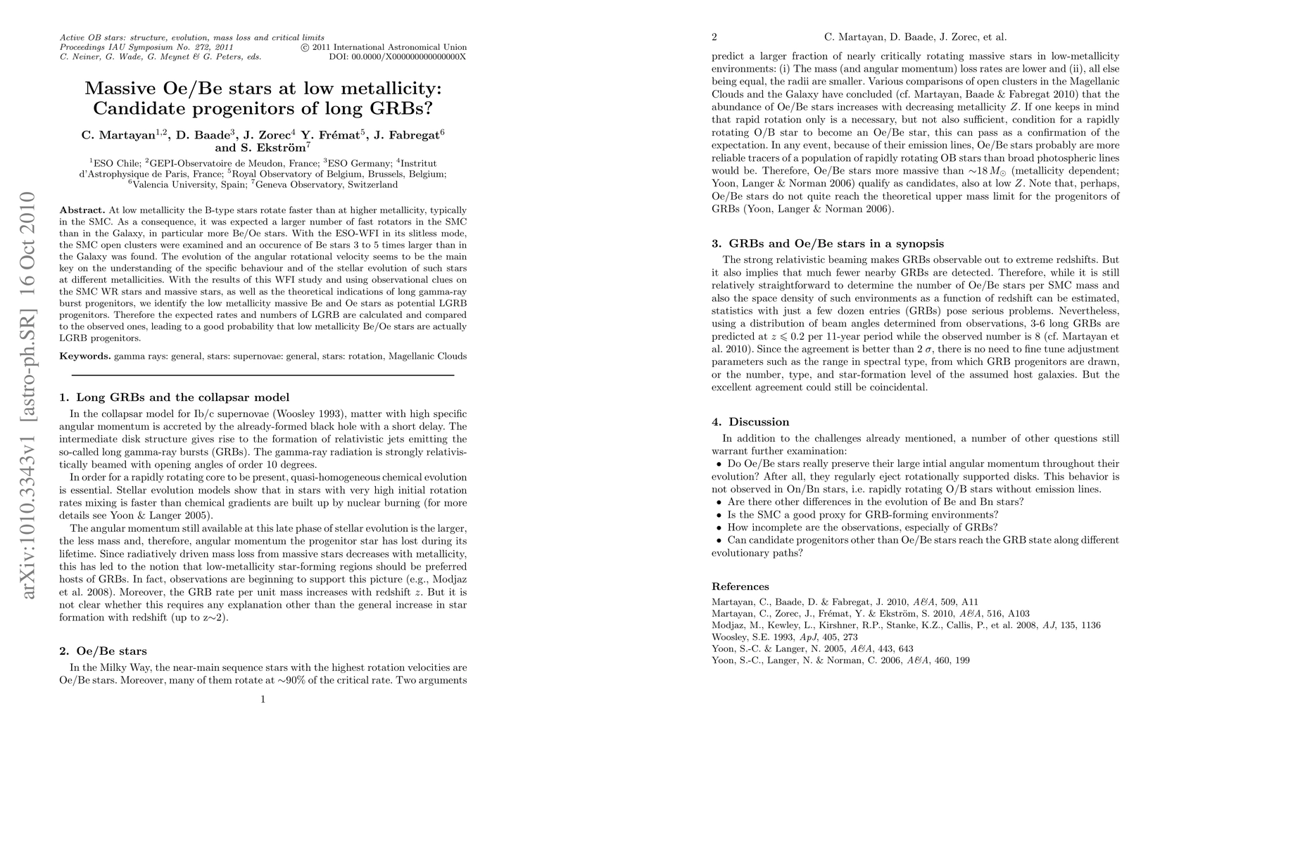 This study finds that low metallicity environments, like the Small Magellanic Cloud (SMC), host a significantly higher occurrence of fast-rotating Be/Oe stars compared to the Milky Way. These stars, along with SMC WR stars and massive stars, are identified as potential progenitors of long gamma-ray bursts (LGRBs), suggesting a good probability that Be/Oe stars at low metallicity are indeed LGRB progenitors.