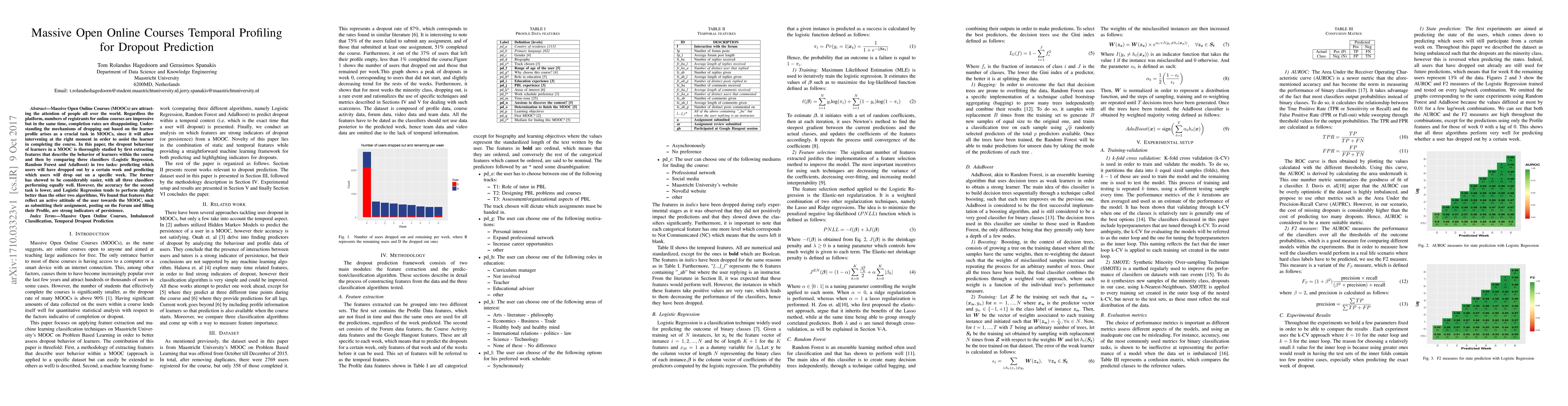 This paper investigates dropout behavior in MOOCs by extracting behavioral features and comparing three classifiers for predicting dropout. Logistic Regression, Random Forest, and AdaBoost were tested in two prediction tasks: general dropout and specific week dropout. The study found that the general task is easier, with all classifiers performing similarly, while Logistic Regression slightly outperforms others in the specific week task. Active behaviors like assignment submissions and forum posts are strong persistence indicators.