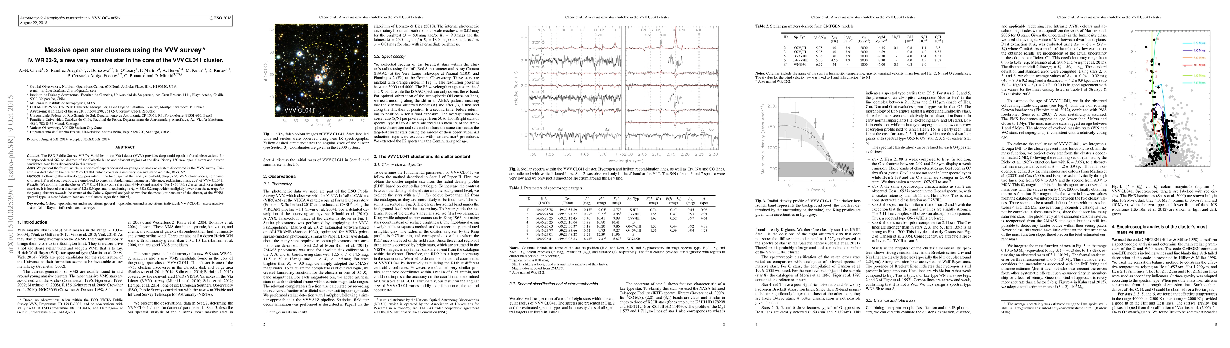 Context The ESO Public Survey VISTA Variables in the V\'ia L\'actea (VVV) provides deep multi-epoch infrared observations for an unprecedented 562 sq. degrees of the Galactic bulge and adjacent regions of the disk. Nearly 150 new open clusters and cluster candidates have been discovered in this survey. Aims We present the fourth article in a series of papers focussed on young and massive clusters discovered in the VVV survey. This article is dedicated to the cluster VVV CL041, which contains a new very massive star candidate, WR 62-2. Methods Following the methodology presented in the first paper of the series, wide-field, deep JHKs VVV observations, combined with new infrared spectroscopy, are employed to constrain fundamental parameters (distance, reddening, mass, age) of VVV CL041. Results We confirm that the cluster VVV CL041 is a young (less than 4 Myrs) and massive (3 +/- 2 x 10^3 Msol) cluster, and not a simple asterism. It is located at a distance of 4.2 +/- 0.9 kpc, and its reddening is A_V = 8.0 +/- 0.2 mag, which is slightly lower than the average for the young clusters towards the centre of the Galaxy. Spectral analysis shows that the most luminous star of the cluster, of the WN8h spectral type, is a candidate to have an initial mass larger than 100 Msol.