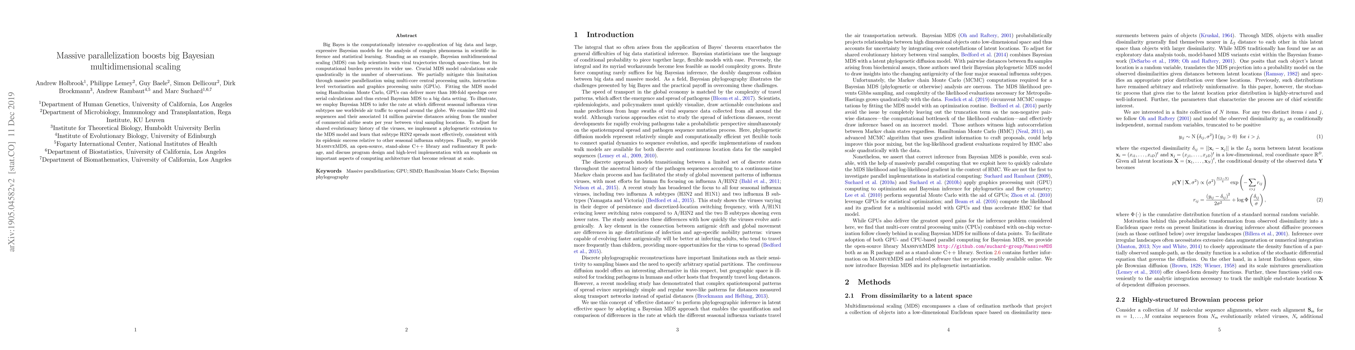 This paper demonstrates how massive parallelization using GPUs and multi-core CPUs can significantly speed up Bayesian multidimensional scaling (MDS) computations, enabling its application to big data. The authors show a 100-fold speedup in fitting the MDS model using Hamiltonian Monte Carlo, allowing the analysis of viral spread across global air traffic networks, and identify H3N2 as the most effective subtype in spreading.