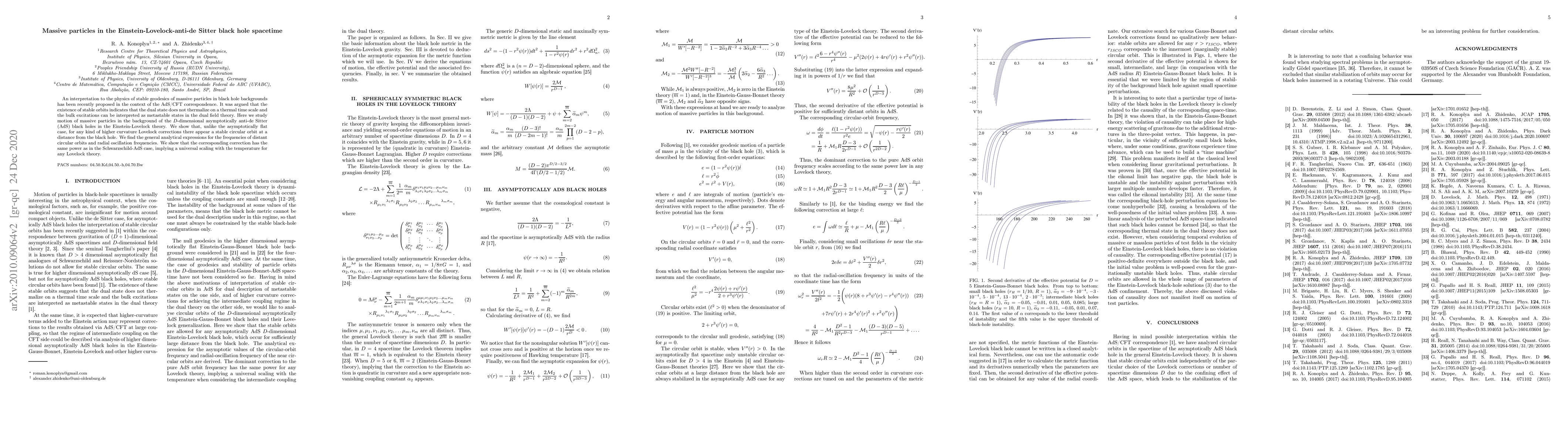 An interpretation to the physics of stable geodesics of massive particles in black hole backgrounds has been recently proposed in the context of the AdS/CFT correspondence. It was argued that the existence of stable orbits indicates that the dual state does not thermalize on a thermal time scale and the bulk excitations can be interpreted as metastable states in the dual field theory. Here we study motion of massive particles in the background of the D-dimensional asymptotically anti-de Sitter (AdS) black holes in the Einstein-Lovelock theory. We show that, unlike the asymptotically flat case, for any kind of higher curvature Lovelock corrections there appear a stable circular orbit at a distance from the black hole. We find the general analytical expressions for the frequencies of distant circular orbits and radial oscillation frequencies. We show that the corresponding correction has the same power as in the Schwarzschild-AdS case, implying a universal scaling with the temperature for any Lovelock theory.