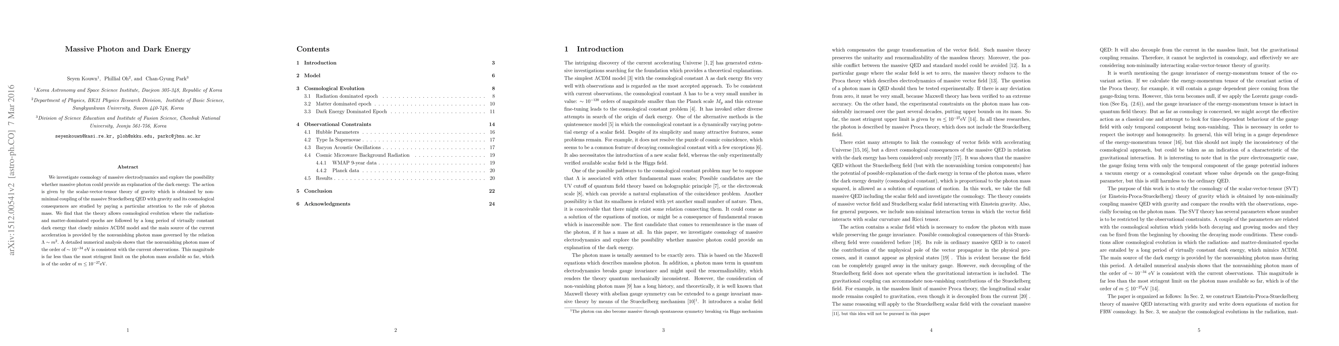 We investigate cosmology of massive electrodynamics and explore the possibility whether massive photon could provide an explanation of the dark energy. The action is given by the scalar-vector-tensor theory of gravity which is obtained by non-minimal coupling of the massive Stueckelberg QED with gravity and its cosmological consequences are studied by paying a particular attention to the role of photon mass. We find that the theory allows cosmological evolution where the radiation- and matter-dominated epochs are followed by a long period of virtually constant dark energy that closely mimics $\Lambda$CDM model and the main source of the current acceleration is provided by the nonvanishing photon mass governed by the relation $\Lambda\sim m^2$. A detailed numerical analysis shows that the nonvanishing photon mass of the order of $\sim 10^{-34}$ eV is consistent with the current observations. This magnitude is far less than the most stringent limit on the photon mass available so far, which is of the order of $m \leq 10^{-27}$eV.