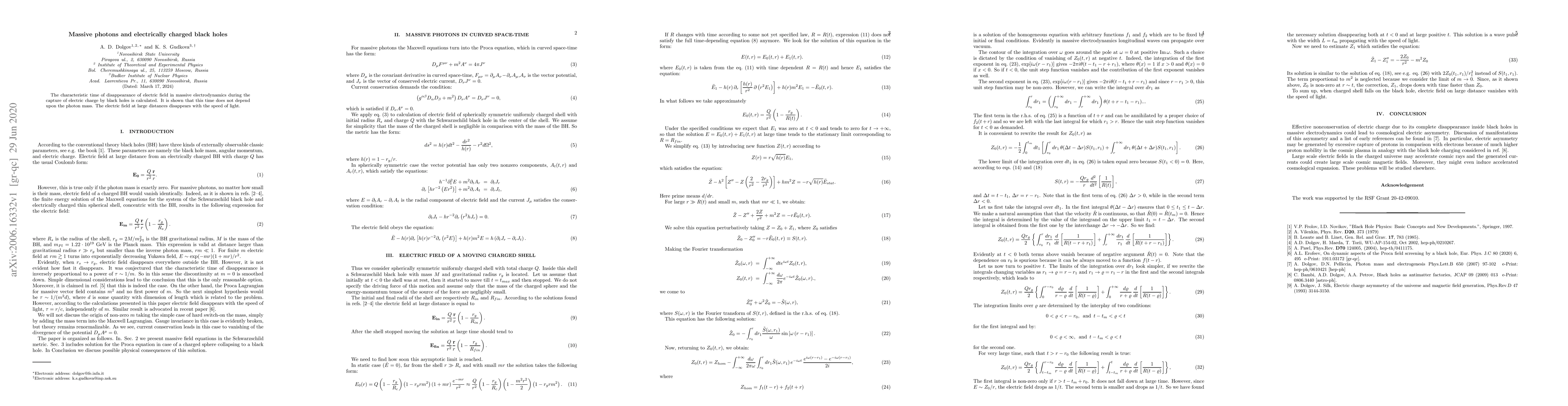 The characteristic time of disappearance of electric field in massive electrodynamics during the capture of electric charge by black holes is calculated. It is shown that this time does not depend upon the photon mass. The electric field at large distances disappears with the speed of light.