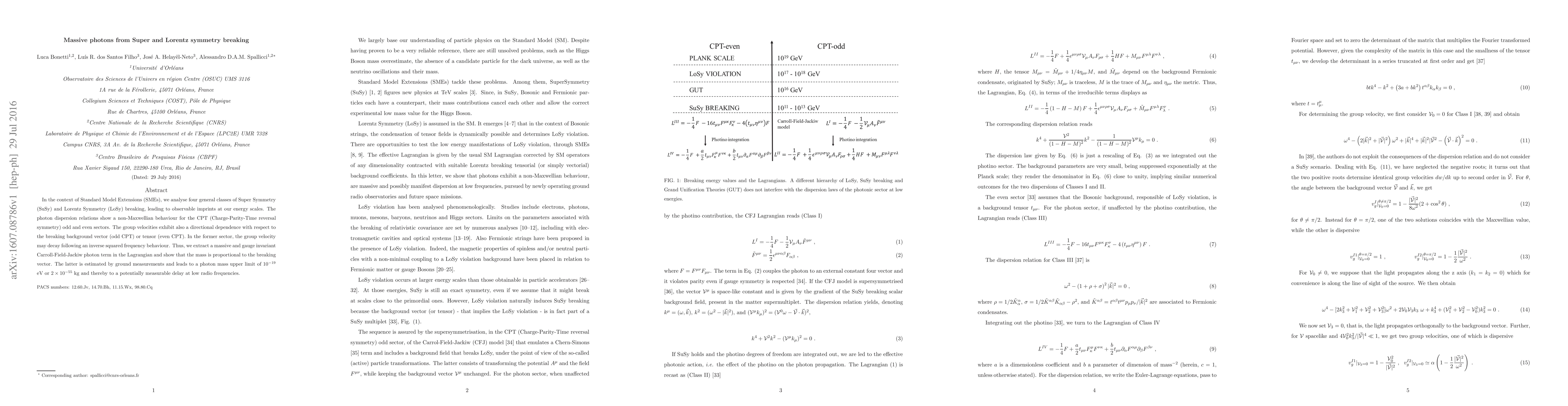 In the context of Standard Model Extensions (SMEs), we analyse four general classes of Super Symmetry (SuSy) and Lorentz Symmetry (LoSy) breaking, leading to {observable} imprints at our energy scales. The photon dispersion relations show a non-Maxwellian behaviour for the CPT (Charge-Parity-Time reversal symmetry) odd and even sectors. The group velocities exhibit also a directional dependence with respect to the breaking background vector (odd CPT) or tensor (even CPT). In the former sector, the group velocity may decay following an inverse squared frequency behaviour. Thus, we extract a massive and gauge invariant Carroll-Field-Jackiw photon term in the Lagrangian and show that the mass is proportional to the breaking vector. The latter is estimated by ground measurements and leads to a photon mass upper limit of $10^{-19}$ eV or $2 \times 10^{-55}$ kg and thereby to a potentially measurable delay at low radio frequencies.