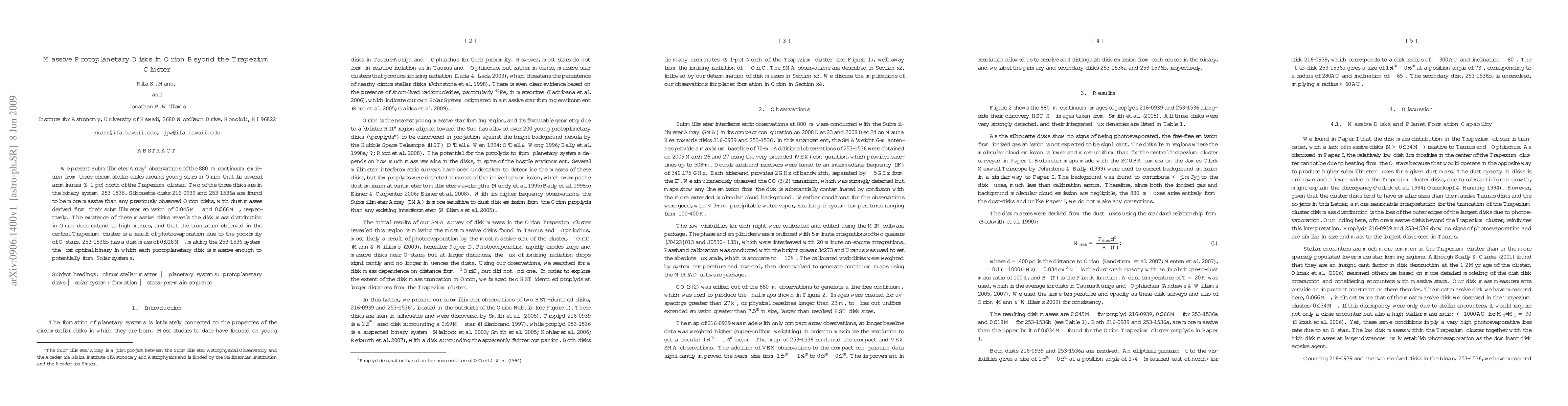 This paper reports on Submillimeter Array observations of three massive protoplanetary disks in Orion, north of the Trapezium cluster, with two in the binary system 253-1536. Disks 216-0939 and 253-1536a have unprecedented masses, suggesting that the disk mass distribution in Orion extends to high masses, and that truncation in the Trapezium cluster is due to photoevaporation from nearby O-stars.