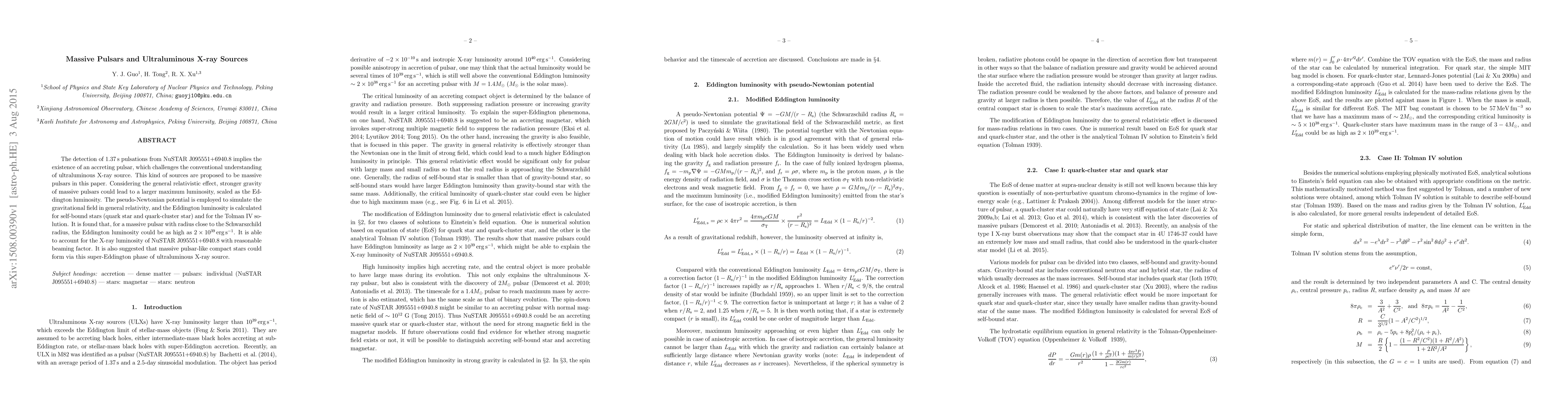 The detection of 1.37$\, $s pulsations from NuSTAR J095551+6940.8 implies the existence of an accreting pulsar, which challenges the conventional understanding of ultraluminous X-ray source. This kind of sources are proposed to be massive pulsars in this paper. Considering the general relativistic effect, stronger gravity of massive pulsars could lead to a larger maximum luminosity, scaled as the Eddington luminosity. The pseudo-Newtonian potential is employed to simulate the gravitational field in general relativity, and the Eddington luminosity is calculated for self-bound stars (quark star and quark-cluster star) and for the Tolman IV solution. It is found that, for a massive pulsar with radius close to the Schwarszchild radius, the Eddington luminosity could be as high as $2\times10^{39} \, {\rm erg\, s}^{-1}$. It is able to account for the X-ray luminosity of NuSTAR J095551+6940.8 with reasonable beaming factor. It is also suggested that massive pulsar-like compact stars could form via this super-Eddington phase of ultraluminous X-ray source.