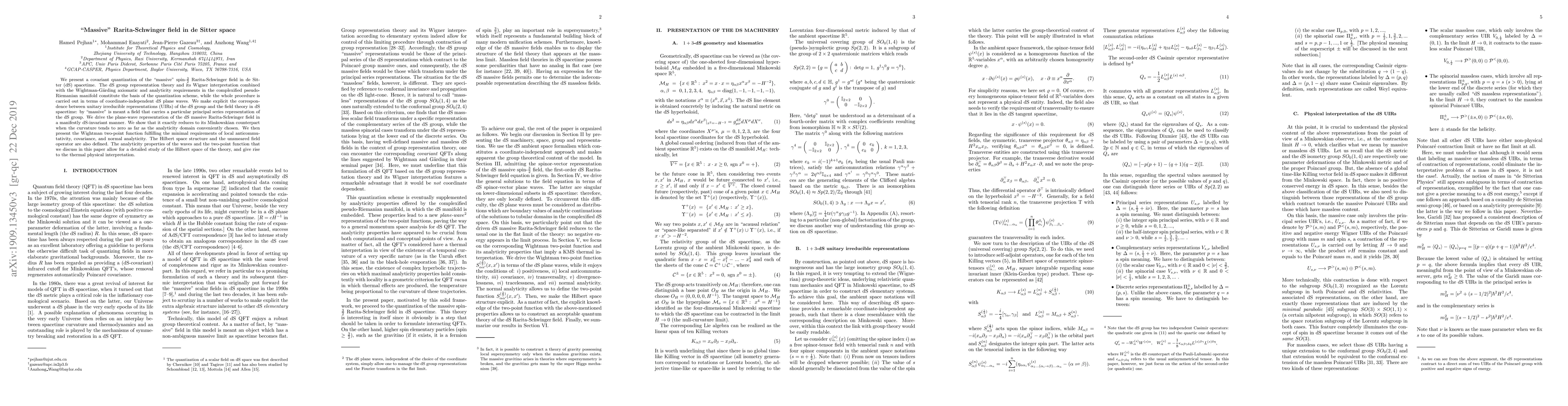 We present a covariant quantization of the "massive" spin-${\frac{3}{2}}$ Rarita-Schwinger field in de Sitter (dS) spacetime. The dS group representation theory and its Wigner interpretation combined with the Wightman-G$\mbox{\"{a}}$rding axiomatic and analyticity requirements in the complexified pseudo-Riemanian manifold constitute the basis of the quantization scheme, while the whole procedure is carried out in terms of coordinate-independent dS plane waves. We make explicit the correspondence between unitary irreducible representations (UIRs) of the dS group and the field theory in dS spacetime: by "massive" is meant a field that carries a particular principal series representation of the dS group. We drive the plane-wave representation of the dS massive Rarita-Schwinger field in a manifestly dS-invariant manner. We show that it exactly reduces to its Minkowskian counterpart when the curvature tends to zero as far as the analyticity domain conveniently chosen. We then present the Wightman two-point function fulfilling the minimal requirements of local anticommutativity, covariance, and normal analyticity. The Hilbert space structure and the unsmeared field operator are also defined. The analyticity properties of the waves and the two-point function that we discuss in this paper allow for a detailed study of the Hilbert space of the theory, and give rise to the thermal physical interpretation.