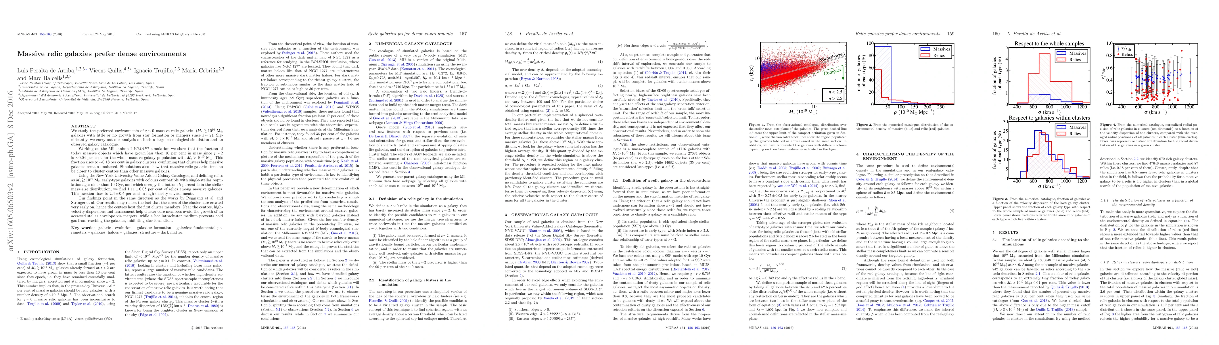 We study the preferred environments of $z \sim 0$ massive relic galaxies ($M_\star \gtrsim 10^{10}~\mathrm{M_\odot}$ galaxies with little or no growth from star formation or mergers since $z \sim 2$). Significantly, we carry out our analysis on both a large cosmological simulation and an observed galaxy catalogue. Working on the Millennium I-WMAP7 simulation we show that the fraction of today massive objects which have grown less than 10 per cent in mass since $z \sim 2$ is ~0.04 per cent for the whole massive galaxy population with $M_\star > 10^{10}~\mathrm{M_\odot}$. This fraction rises to ~0.18 per cent in galaxy clusters, confirming that clusters help massive galaxies remain unaltered. Simulations also show that massive relic galaxies tend to be closer to cluster centres than other massive galaxies. Using the New York University Value-Added Galaxy Catalogue, and defining relics as $M_\star \gtrsim 10^{10}~\mathrm{M_\odot}$ early-type galaxies with colours compatible with single-stellar population ages older than 10 Gyr, and which occupy the bottom 5-percentile in the stellar mass-size distribution, we find $1.11 \pm 0.05$ per cent of relics among massive galaxies. This fraction rises to $2.4 \pm 0.4$ per cent in high-density environments. Our findings point in the same direction as the works by Poggianti et al. and Stringer et al. Our results may reflect the fact that the cores of the clusters are created very early on, hence the centres host the first cluster members. Near the centres, high-velocity dispersions and harassment help cluster core members avoid the growth of an accreted stellar envelope via mergers, while a hot intracluster medium prevents cold gas from reaching the galaxies, inhibiting star formation.
