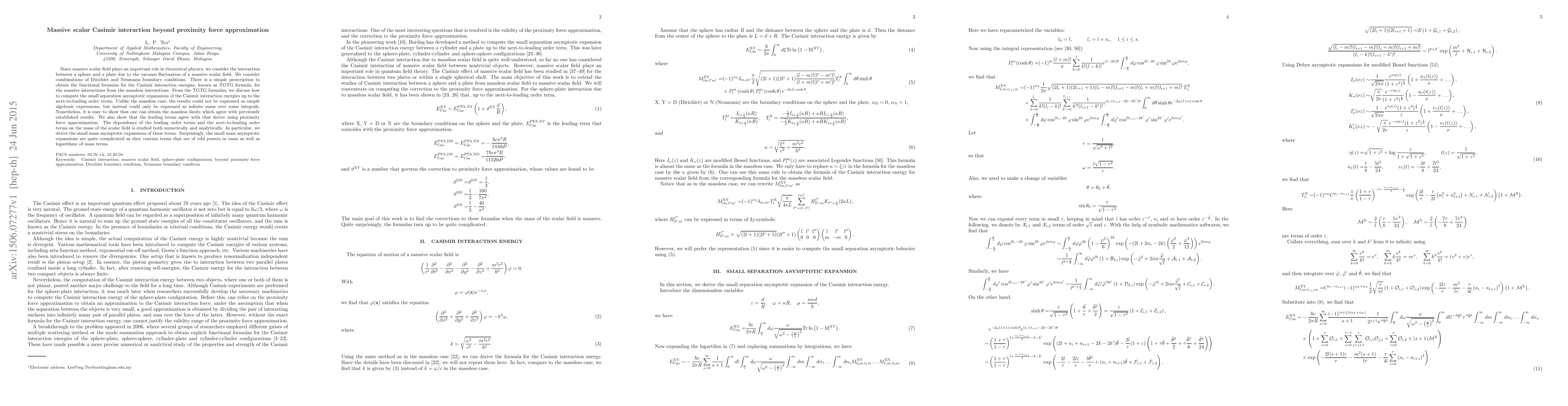 Since massive scalar field plays an important role in theoretical physics, we consider the interaction between a sphere and a plate due to the vacuum fluctuation of a massive scalar field. We consider combinations of Dirichlet and Neumann boundary conditions. There is a simple prescription to obtain the functional formulas for the Casimir interaction energies, known as TGTG formula, for the massive interactions from the massless interactions. From the TGTG formulas, we discuss how to compute the small separation asymptotic expansions of the Casimir interaction energies up to the next-to-leading order terms. Unlike the massless case, the results could not be expressed as simple algebraic expressions, but instead could only be expressed as infinite sums over some integrals. Nonetheless, it is easy to show that one can obtain the massless limits which agree with previously established results. We also show that the leading terms agree with that derive using proximity force approximation. The dependence of the leading order terms and the next-to-leading order terms on the mass of the scalar field is studied both numerically and analytically. In particular, we derive the small mass asymptotic expansions of these terms. Surprisingly, the small mass asymptotic expansions are quite complicated as they contain terms that are of odd powers in mass as well as logarithms of mass terms.