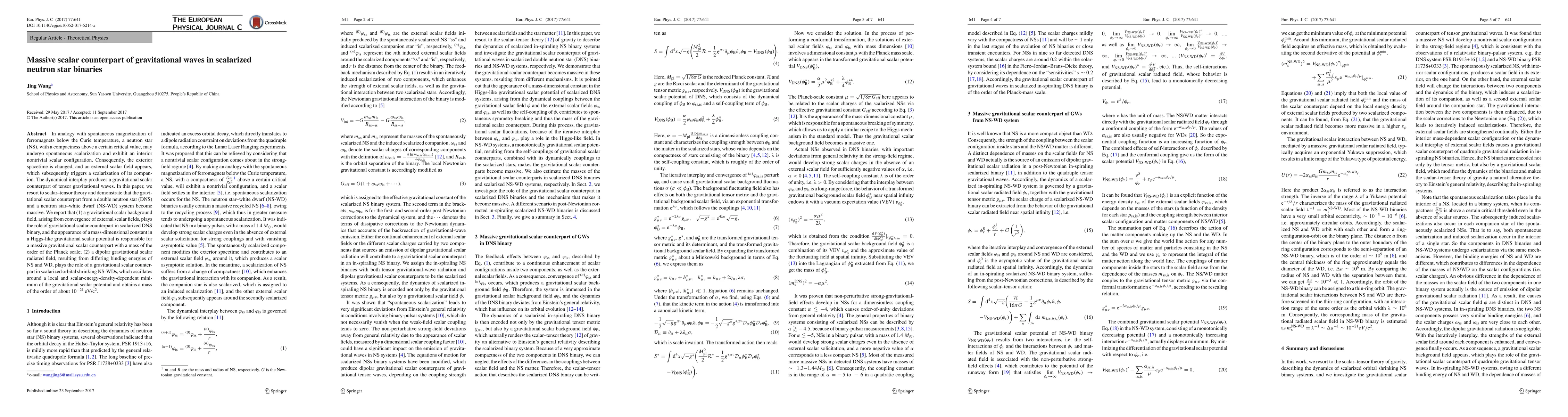In analogy with spontaneous magnetization of ferromagnets below the Curie temperature, a neutron star (NS), with a compactness above a certain critical value, may undergo spontaneous scalarization and exhibit an interior nontrivial scalar configuration. Consequently, the exterior space-time is changed, and an external scalar field appears, which subsequently triggers a scalarization of its companion. The dynamical interplay produces a gravitational scalar counterpart of tensor gravitational waves. In this paper, we resort to scalar-tensor theory and demonstrate that the gravitational scalar counterpart from double neutron star (DNS) and neutron star-white dwarf (NS-WD) become massive. We report that (i) a gravitational scalar background field, arising from convergence of external scalar fields, plays the role of gravitational scalar counterpart in scalarized DNS binary, and the appearance of a mass-dimensional constant in Higgs-like gravitational scalar potential is responsible for a massive gravitational scalar counterpart with mass of order of Planck scale; (ii) a dipolar gravitational scalar radiated field, resulting from different binding energy of NS and WD, plays the role of gravitational scalar counterpart in scalarized orbital shrinking NS-WDs, which oscillates around a local and scalar-energy-density dependent minimum of the gravitational scalar potential and gains a mass of the order of about $10^{-21} ev/c^2$.