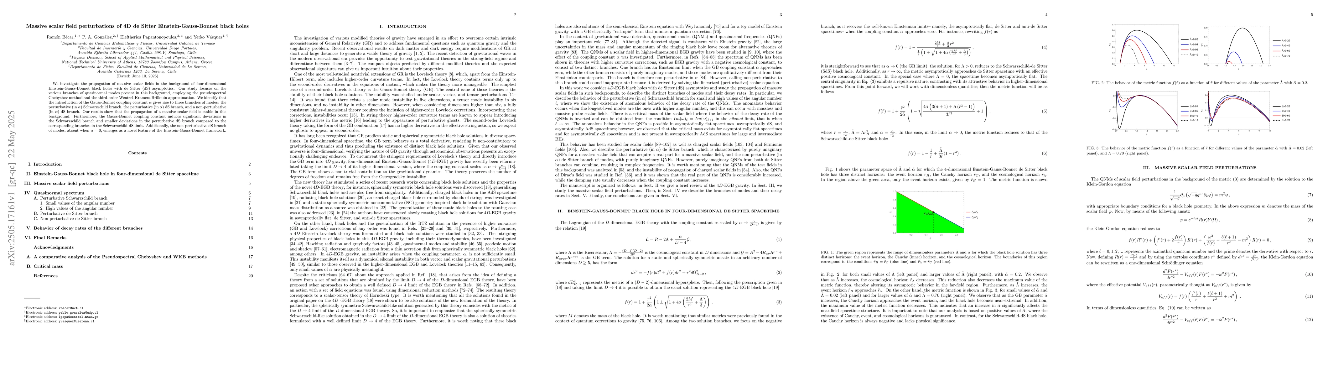 Research investigates massive scalar field perturbations in 4D de Sitter Einstein-Gauss-Bonnet black holes, finding stable propagation and significant deviations from Schwarzschild limits, with a new non-perturbative dS branch emerging at nonzero Gauss-Bonnet coupling constant.
