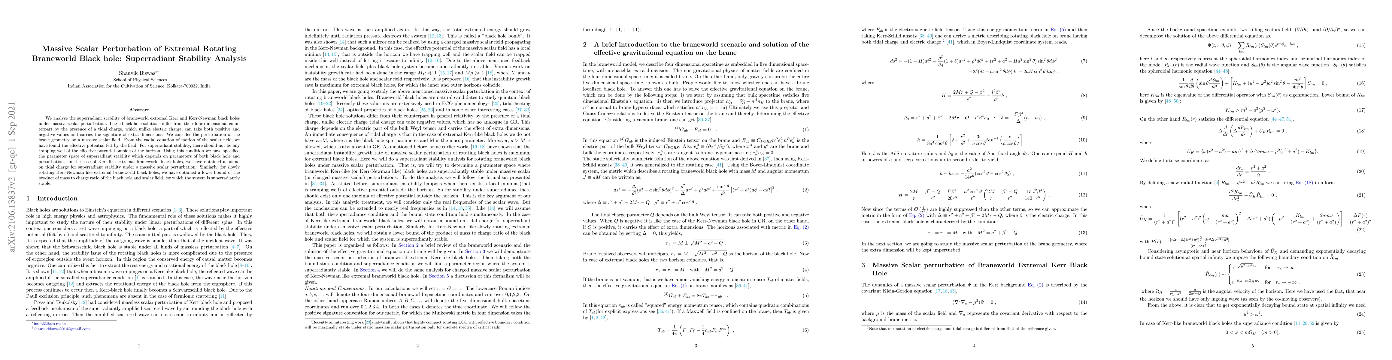 This paper investigates the superradiant stability of extremal rotating braneworld black holes under massive scalar perturbations, finding conditions for which the black holes remain stable. It establishes bounds on tidal charge and mass-to-charge ratios for stability in Kerr and Kerr-Newman braneworld solutions.