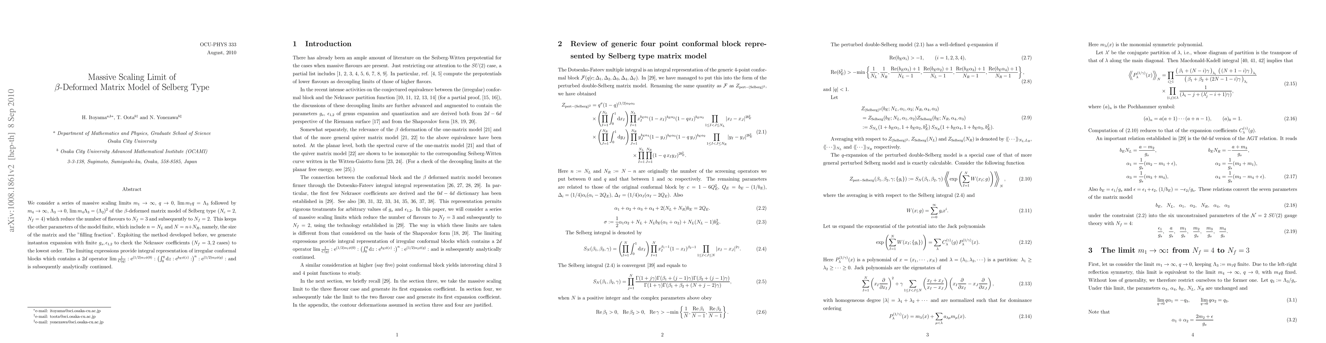 Researchers studied a beta-deformed matrix model of Selberg type under various scaling limits, generating instanton expansion to investigate Nekrasov coefficients and their relation to irregular conformal blocks. The study provides integral representation and analytical continuation of the 2D operator.