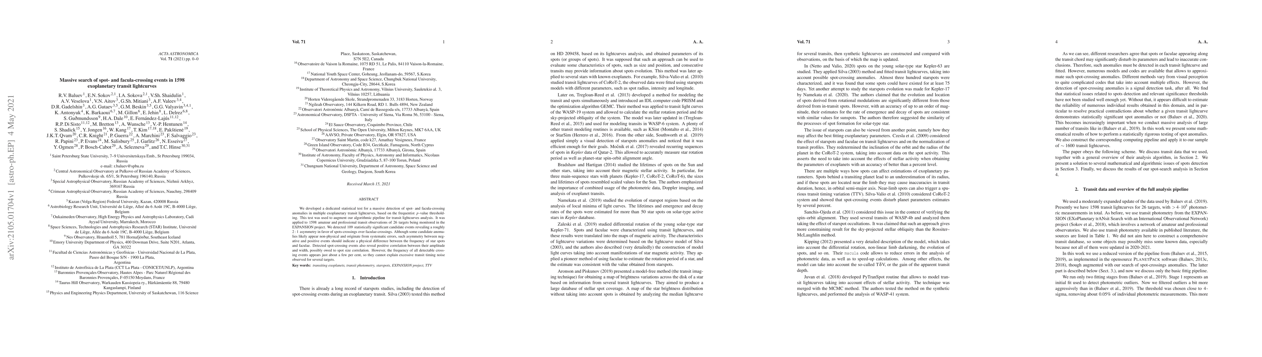 We developed a dedicated statistical test for a massive detection of spot- and facula-crossing anomalies in multiple exoplanetary transit lightcurves, based on the frequentist $p$-value thresholding. This test was used to augment our algorithmic pipeline for transit lightcurves analysis. It was applied to $1598$ amateur and professional transit observations of $26$ targets being monitored in the EXPANSION project. We detected $109$ statistically significant candidate events revealing a roughly $2:1$ asymmetry in favor of spots-crossings over faculae-crossings. Although some candidate anomalies likely appear non-physical and originate from systematic errors, such asymmetry between negative and positive events should indicate a physical difference between the frequency of star spots and faculae. Detected spot-crossing events also reveal positive correlation between their amplitude and width, possibly owed to spot size correlation. However, the frequency of all detectable crossing events appears just about a few per cent, so they cannot explain excessive transit timing noise observed for several targets.