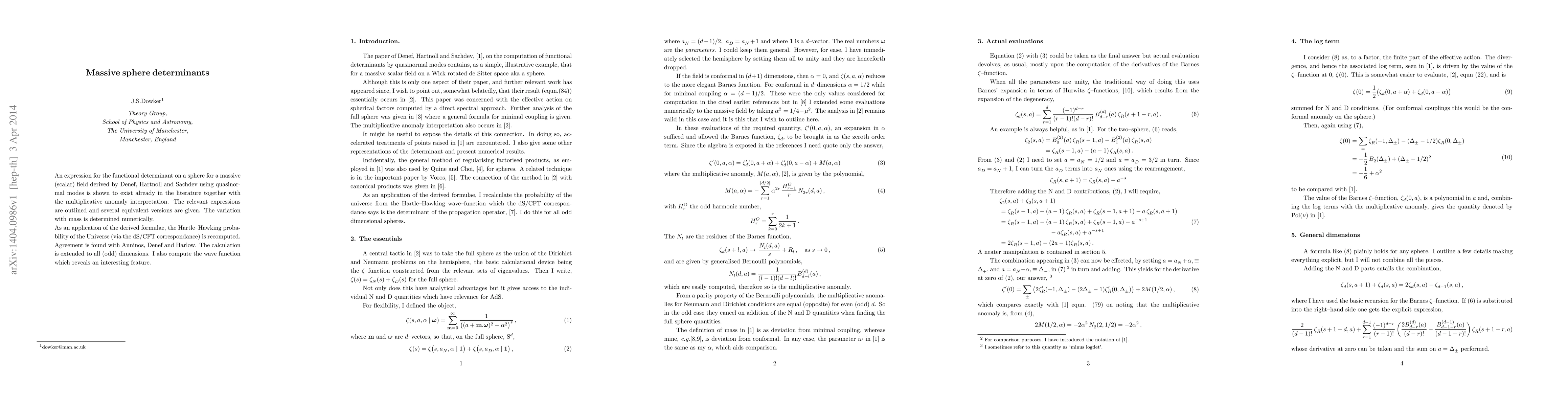 An expression for the functional determinant on a sphere for a massive (scalar) field derived by Denef, Hartnoll and Sachdev using quasinormal modes is shown to exist already in the literature together with the multiplicative anomaly interpretation. The relevant expressions are outlined and several equivalent versions are given. The variation with mass is determined numerically. As an application of the derived formulae, the Hartle--Hawking probability of the Universe (via the dS/CFT correspondance) is recomputed. Agreement is found with Anninos, Denef and Harlow. The calculation is extended to all (odd) dimensions. I also compute the wave function which reveals an interesting feature.