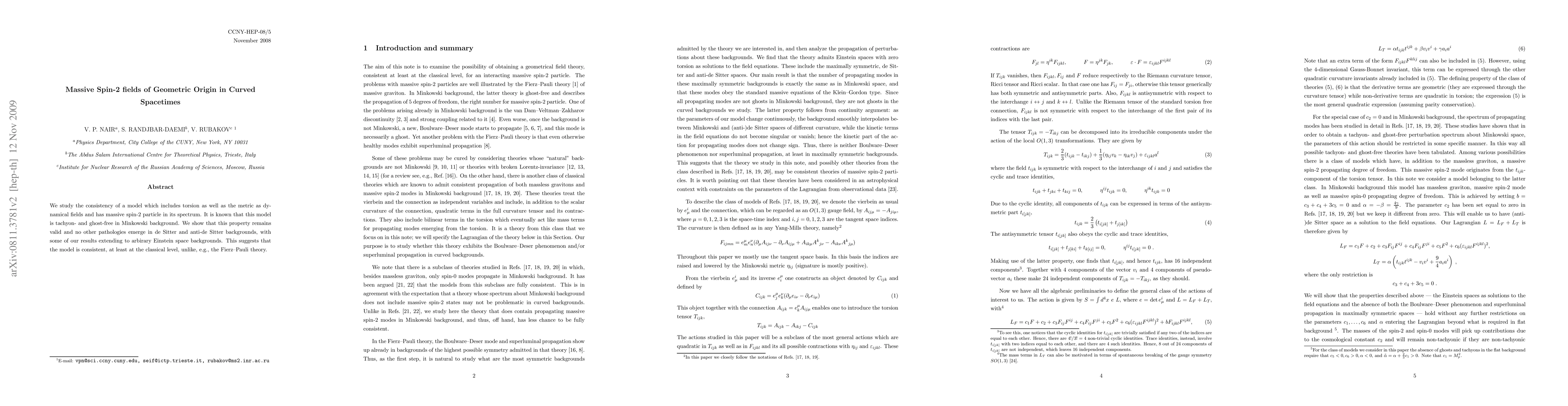We study the consistency of a model which includes torsion as well as the metric as dynamical fields and has massive spin-2 particle in its spectrum. The massive spin-2 mode resides in the torsion, rather than in the metric. It is known that this model is tachyon- and ghost-free in Minkowski background. We show that this property remains valid and no other pathologies emerge in de Sitter and anti-de Sitter backgrounds, with some of our results extending to arbirary Einstein space backgrounds. This suggests that the model is consistent, at least at the classical level, unlike, e.g., the Fierz--Pauli theory.