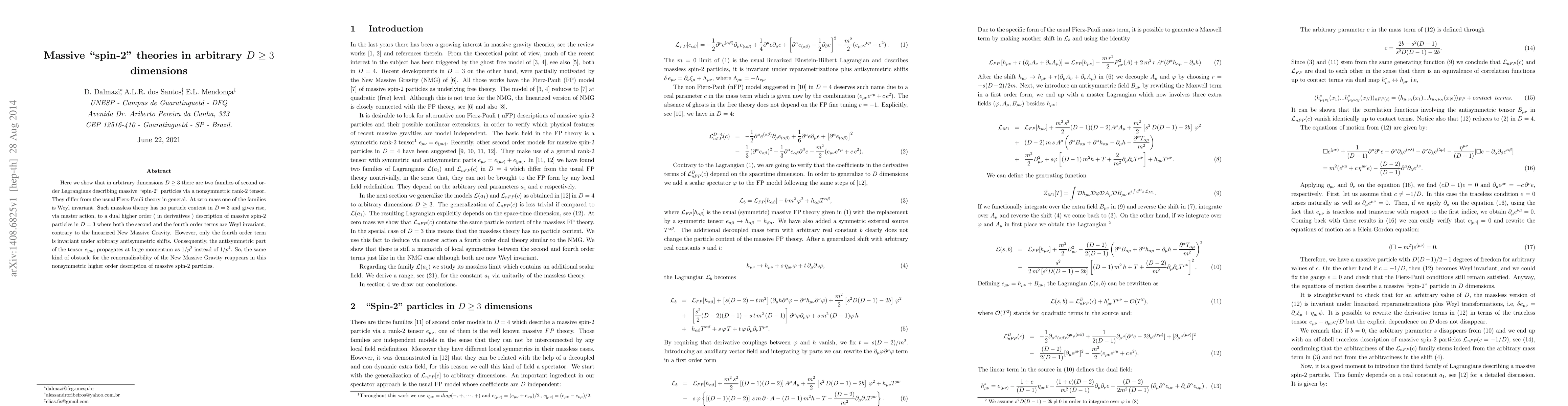 This paper explores two families of second-order Lagrangians in $D\ge 3$ dimensions describing massive "spin-2" particles through a nonsymmetric rank-2 tensor, differing from the standard Fierz-Pauli theory. At zero mass, one family exhibits Weyl invariance, leading to a dual higher-order description in $D=3$ that retains Weyl invariance but faces similar renormalizability issues as New Massive Gravity.