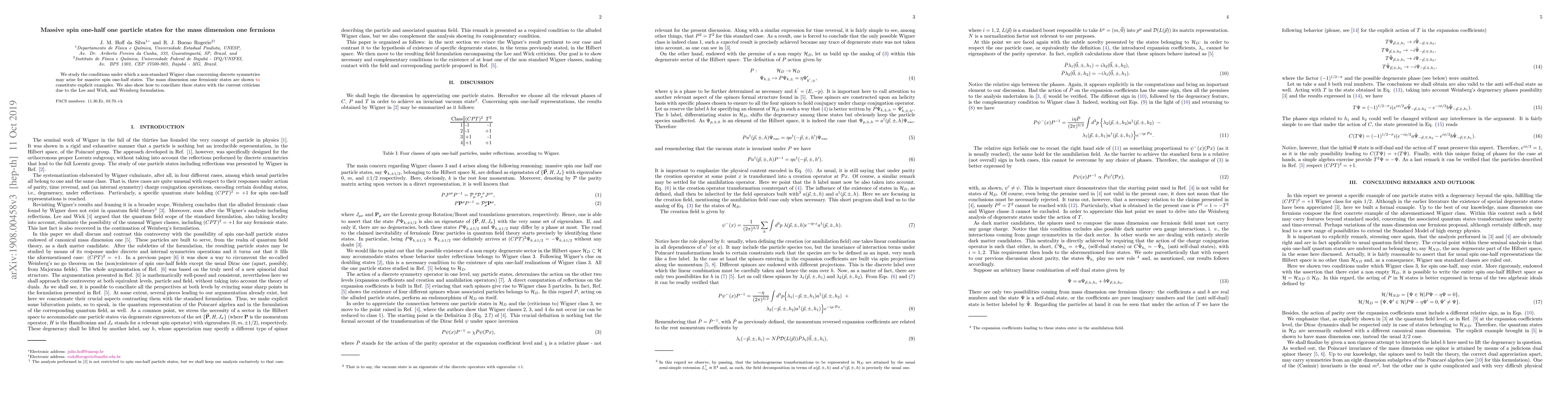 We study the conditions under which a non-standard Wigner class concerning discrete symmetries may arise for massive spin one-half states. The mass dimension one fermionic states are shown \textcolor{red}{to} constitute explicit examples. We also show how to conciliate these states with the current criticism due to the Lee and Wick, and Weinberg formulation.