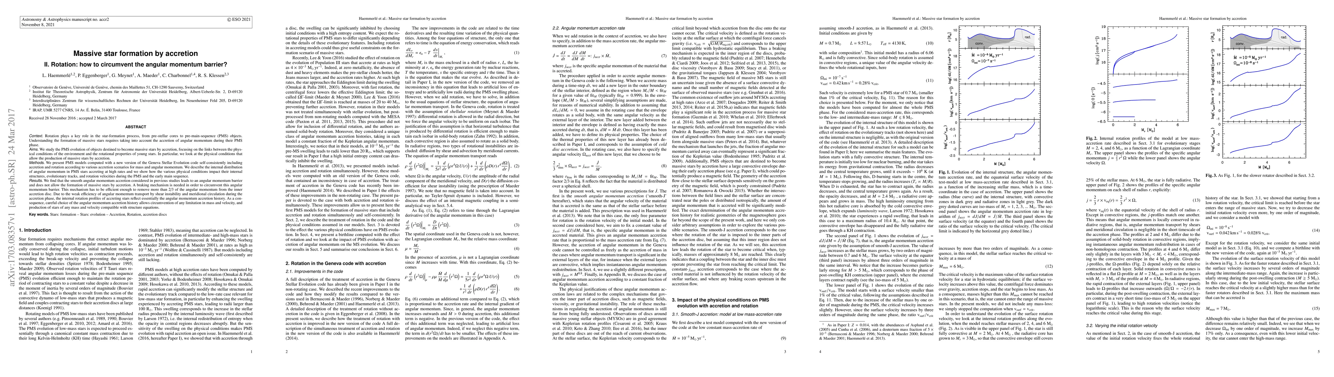Rotation plays a key role in the star-formation process, from pre-stellar cores to pre-main-sequence (PMS) objects. Understanding the formation of massive stars requires taking into account the accretion of angular momentum during their PMS phase. We study the PMS evolution of objects destined to become massive stars by accretion, focusing on the links between the physical conditions of the environment and the rotational properties of young stars. In particular, we look at the physical conditions that allow the production of massive stars by accretion. We present PMS models computed with a new version of the Geneva Stellar Evolution code self-consistently including accretion and rotation according to various accretion scenarios for mass and angular momentum. We describe the internal distribution of angular momentum in PMS stars accreting at high rates and we show how the various physical conditions impact their internal structures, evolutionary tracks, and rotation velocities during the PMS and the early main sequence. We find that the smooth angular momentum accretion considered in previous studies leads to an angular momentum barrier and does not allow the formation of massive stars by accretion. A braking mechanism is needed in order to circumvent this angular momentum barrier. This mechanism has to be efficient enough to remove more than 2/3 of the angular momentum from the inner accretion disc. Due to the weak efficiency of angular momentum transport by shear instability and meridional circulation during the accretion phase, the internal rotation profiles of accreting stars reflect essentially the angular momentum accretion history. As a consequence, careful choice of the angular momentum accretion history allows circumvention of any limitation in mass and velocity, and production of stars of any mass and velocity compatible with structure equations.