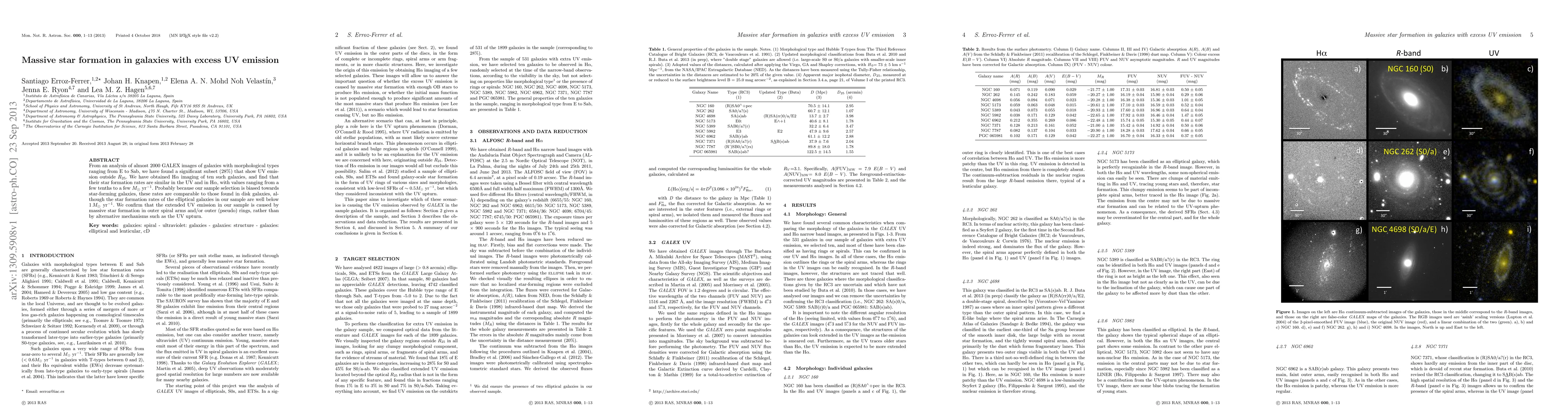 From an analysis of almost 2000 GALEX images of galaxies with morphological types ranging from E to Sab, we have found a significant subset (28%) that show UV emission outside $R_{25}$. We have obtained H$\alpha$ imaging of ten such galaxies, and find that their star formation rates are similar in the UV and in H$\alpha$, with values ranging from a few tenths to a few $M_{\odot} $ yr$ ^{-1} $. Probably because our sample selection is biased towards star-forming galaxies, these rates are comparable to those found in disk galaxies, although the star formation rates of the elliptical galaxies in our sample are well below $1\,M_{\odot} $ yr$ ^{-1}$. We confirm that the extended UV emission in our sample is caused by massive star formation in outer spiral arms and/or outer (pseudo) rings, rather than by alternative mechanisms such as the UV upturn.