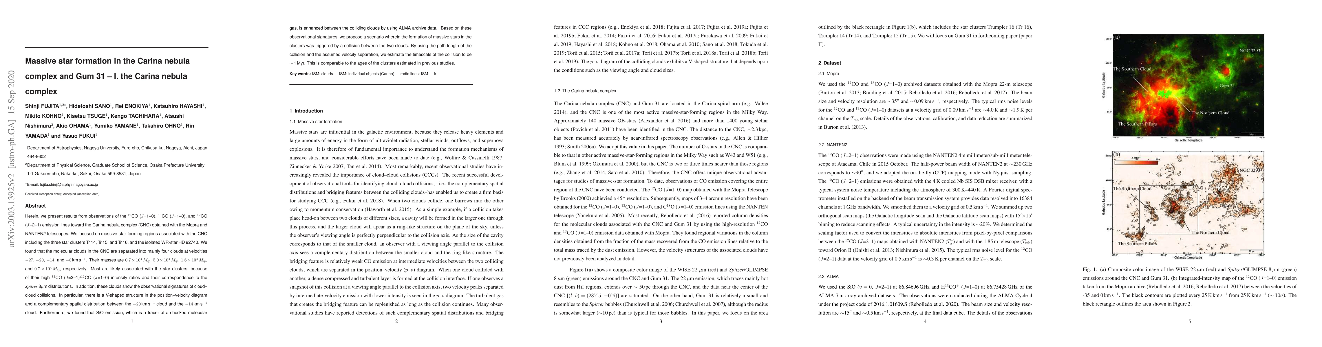 This study investigates the Carina nebula complex using CO emission lines, identifying four molecular clouds likely associated with massive star clusters. The findings suggest that cloud-cloud collisions may have triggered massive star formation, with an estimated collision timescale of about 1 Myr.