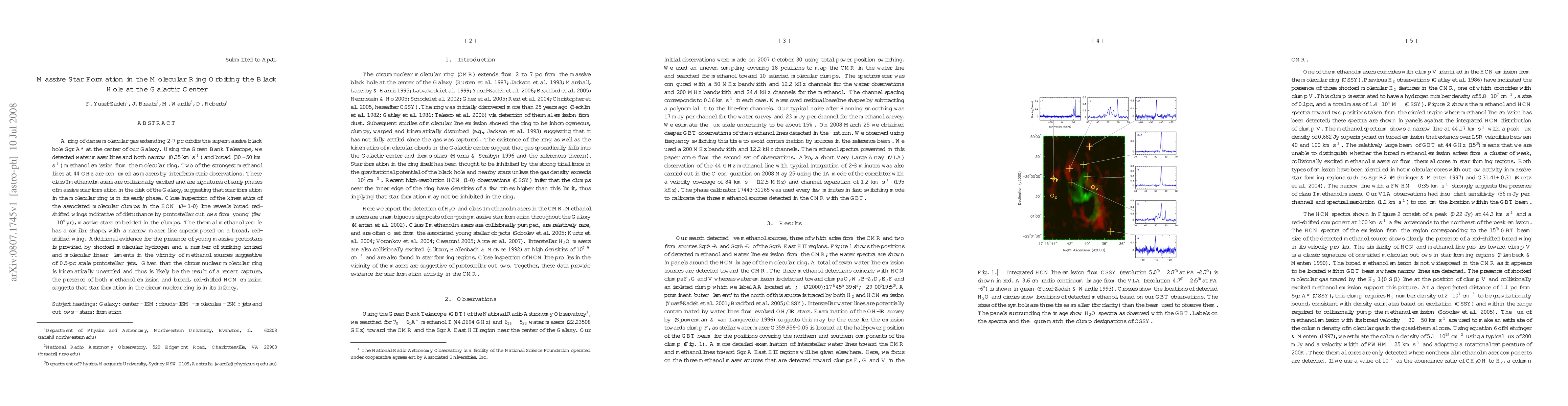 This paper uses the Green Bank Telescope to detect methanol masers and emissions in the molecular ring orbiting the supermassive black hole Sgr A* at the Galactic Center, indicating early-phase massive star formation. Evidence includes protostellar outflows and ionized filaments, suggesting the circumnuclear ring is experiencing nascent star formation.