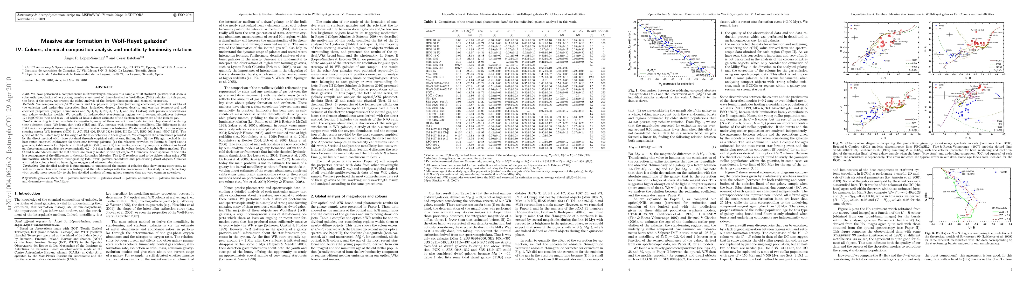 (Abridged) We performed a multiwavelength analysis of a sample of starburst galaxies that show the presence of a substantial population of very young massive (WR) stars. Here we present the global analysis of the derived photometric and chemical properties. We compare optical/NIR colours and the physical properties (reddening coefficient, equivalent widths of the emission and underlying absorption lines, ionization degree, electron density, and electron temperature) and chemical properties with previous observations and galaxy evolution models. Attending to their absolute B-magnitude many of them are not dwarf galaxies, but they should be during their quiescent phase. We found that both C(Hb) and Wabs increase with increasing metallicity. We detected a high N/O ratio in objects showing strong WR features. The ejecta of the WR stars may be the origin of the N enrichment in these galaxies. We compared the abundances provided by the direct method with those obtained using empirical calibrations, finding that (i) the Pilyugin method is the best suitable empirical calibration, (ii) the relations between the oxygen abundance and the N2 or the O3N2 parameters provided by Pettini & Pagel (2004) give acceptable results for objects with 12+log(O/H)>8.0, and (iii) the results provided by empirical calibrations based on photoionization models are systematically 0.2-0.3 dex higher than the values derived from the direct method. The O and N abundances and the N/O ratios are related to the optical/NIR luminosity; the dispersion is consequence of the differences in the star-formation histories. Galaxies with redder colours tend to have higher oxygen and nitrogen abundances. Our detailed analysis is fundamental to understand the nature of galaxies showing strong starbursts, as well as to know their star formation history and the relationships with the environment.