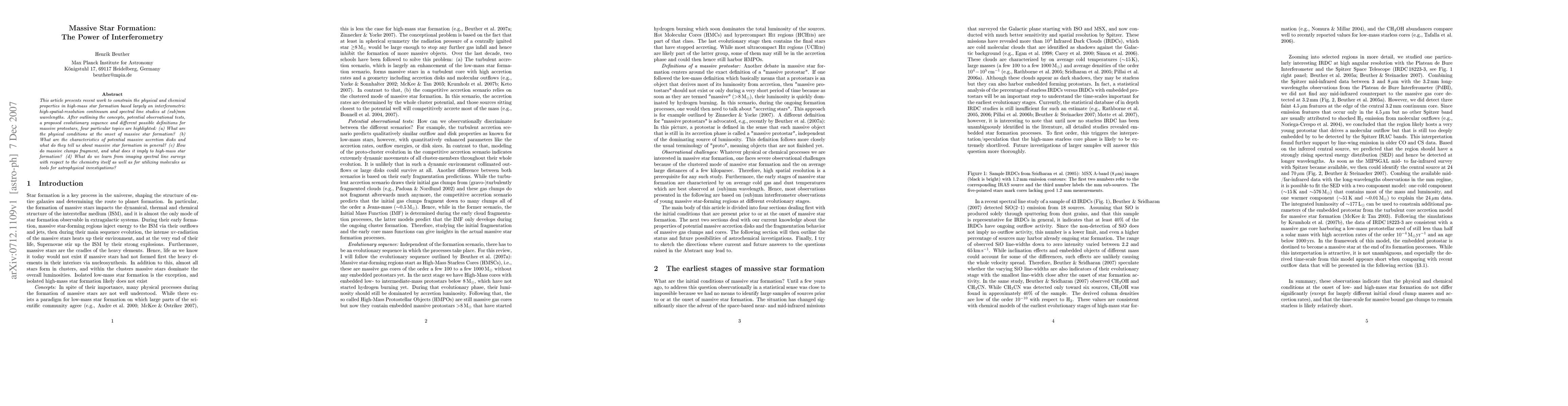 This paper explores the physical and chemical properties of high-mass star formation using interferometry, focusing on the conditions at the onset of star formation, the nature of massive accretion disks, the fragmentation of massive clumps, and insights from spectral line surveys on chemistry and molecular tools in astrophysics.