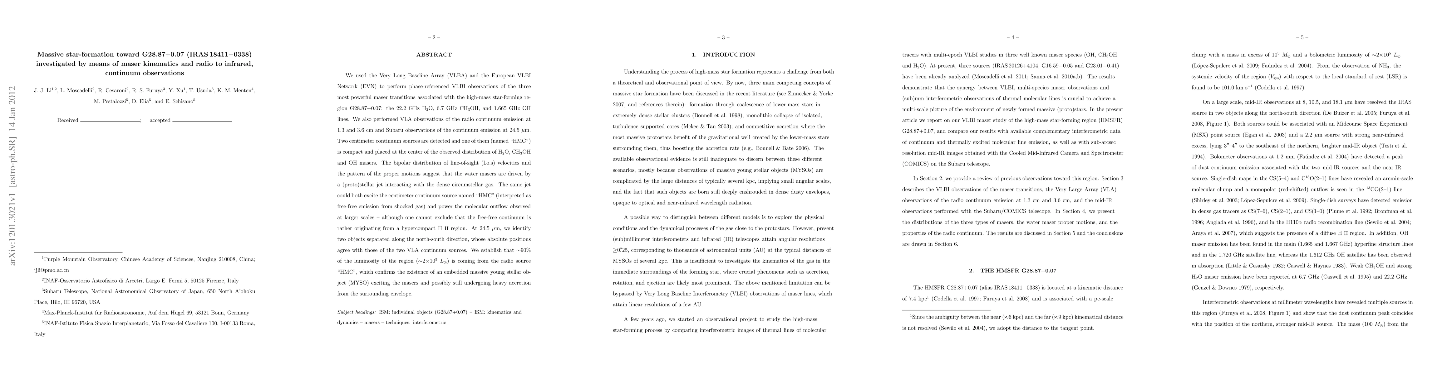 We used the Very Long Baseline Array (VLBA) and the European VLBI Network (EVN) to perform phase-referenced VLBI observations of the three most powerful maser transitions associated with the high-mass star-forming region G28.87+0.07: the 22.2 GHz H$_{2}$O, 6.7 GHz CH$_{3}$OH, and 1.665 GHz OH lines. We also performed VLA observations of the radio continuum emission at 1.3 and 3.6 cm and Subaru observations of the continuum emission at 24.5 $\mu$m. Two centimeter continuum sources are detected and one of them (named "HMC") is compact and placed at the center of the observed distribution of H$_{2}$O, CH$_{3}$OH and OH masers. The bipolar distribution of line-of-sight (l.o.s) velocities and the pattern of the proper motions suggest that the water masers are driven by a (proto)stellar jet interacting with the dense circumstellar gas. The same jet could both excite the centimeter continuum source named "HMC" (interpreted as free-free emission from shocked gas) and power the molecular outflow observed at larger scales -- although one cannot exclude that the free-free continuum is rather originating from a hypercompact \ion{H}{2} region. At 24.5 $\mu$m, we identify two objects separated along the north-south direction, whose absolute positions agree with those of the two VLA continuum sources. We establish that $\sim$90% of the luminosity of the region ($\sim$\times10^{5} L_\sun$) is coming from the radio source "HMC", which confirms the existence of an embedded massive young stellar object (MYSO) exciting the masers and possibly still undergoing heavy accretion from the surrounding envelope.