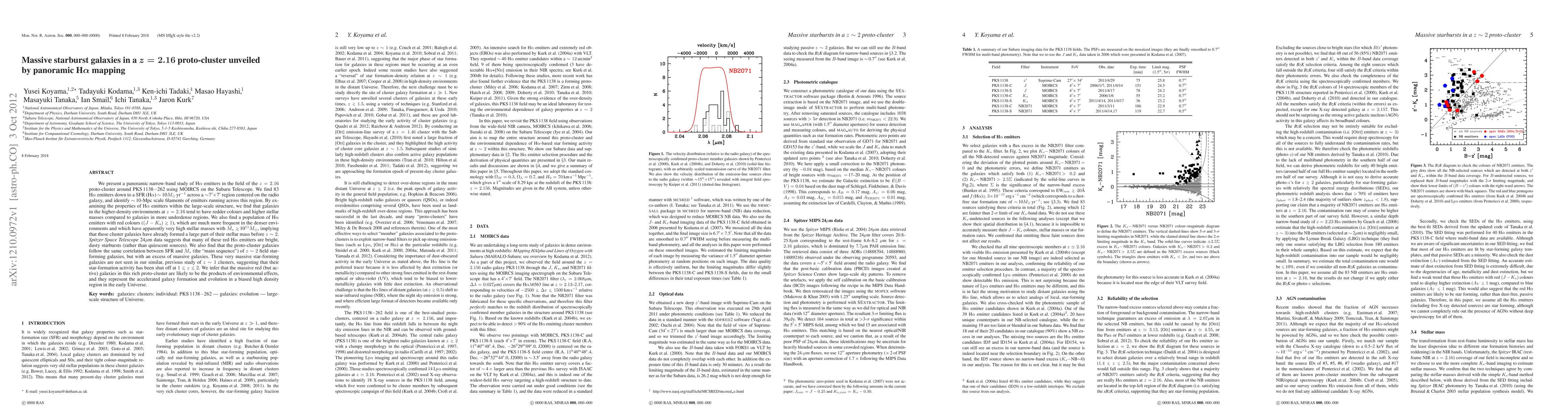 This paper uses panoramic H-alpha mapping to identify massive starburst galaxies in a z=2.16 proto-cluster around PKS1138-262, revealing 83 H-alpha emitters with high star-formation rates and red colors indicative of significant dust and stellar mass. The study suggests these galaxies formed a large part of their mass before z~2, indicating accelerated galaxy formation and evolution in high-density early Universe environments.