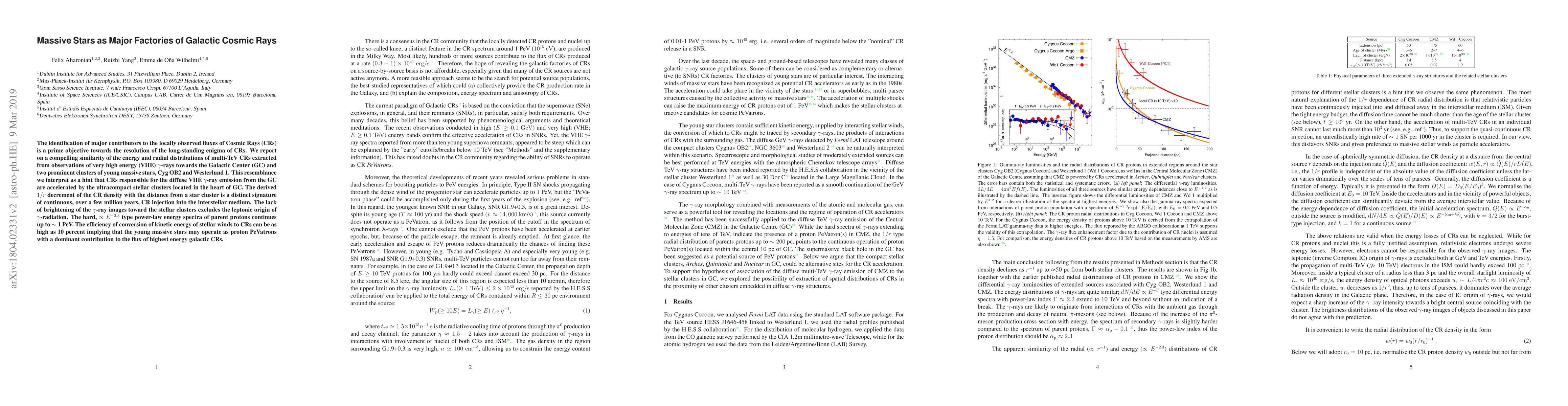 This research identifies massive stellar clusters, particularly those in the Galactic Center and Cyg OB2, as major producers of PeV cosmic rays (CRs). The study finds a correlation between the energy and radial distributions of multi-TeV CRs and VHE gamma-ray observations, suggesting continuous CR injection over millions of years. The lack of leptonic gamma-ray origin and the hard proton energy spectra imply that massive stars can act as 'Pevatrons', contributing significantly to the highest-energy galactic CRs.