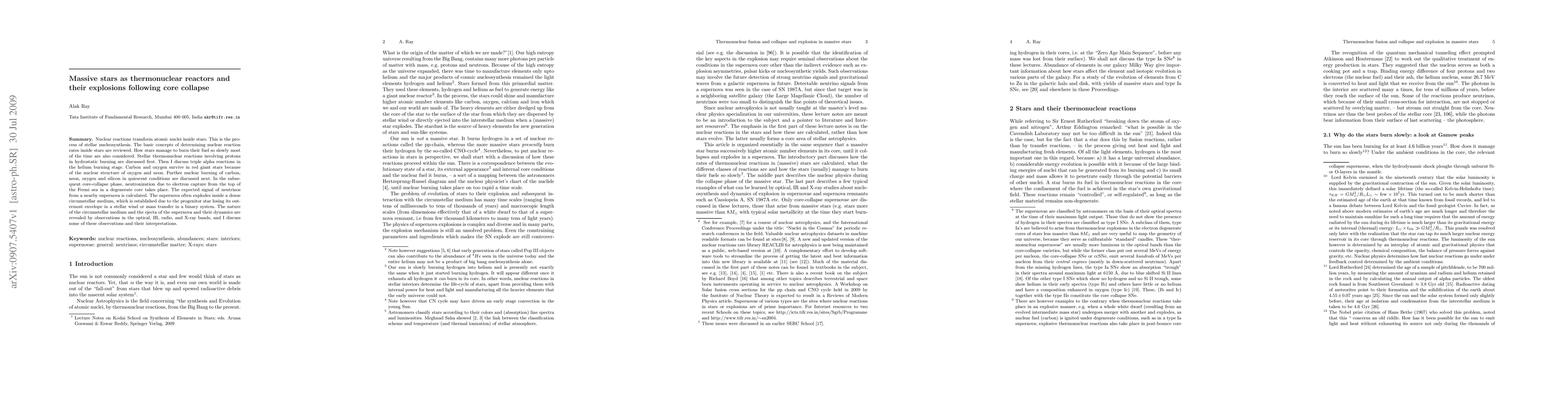 Nuclear reactions transform atomic nuclei inside stars. This is the process of stellar nucleosynthesis. The basic concepts of determining nuclear reaction rates inside stars are reviewed. How stars manage to burn their fuel so slowly most of the time are also considered. Stellar thermonuclear reactions involving protons in hydrostatic burning are discussed first. Then I discuss triple alpha reactions in the helium burning stage. Carbon and oxygen survive in red giant stars because of the nuclear structure of oxygen and neon. Further nuclear burning of carbon, neon, oxygen and silicon in quiescent conditions are discussed next. In the subsequent core-collapse phase, neutronization due to electron capture from the top of the Fermi sea in a degenerate core takes place. The expected signal of neutrinos from a nearby supernova is calculated. The supernova often explodes inside a dense circumstellar medium, which is established due to the progenitor star losing its outermost envelope in a stellar wind or mass transfer in a binary system. The nature of the circumstellar medium and the ejecta of the supernova and their dynamics are revealed by observations in the optical, IR, radio, and X-ray bands, and I discuss some of these observations and their interpretations.