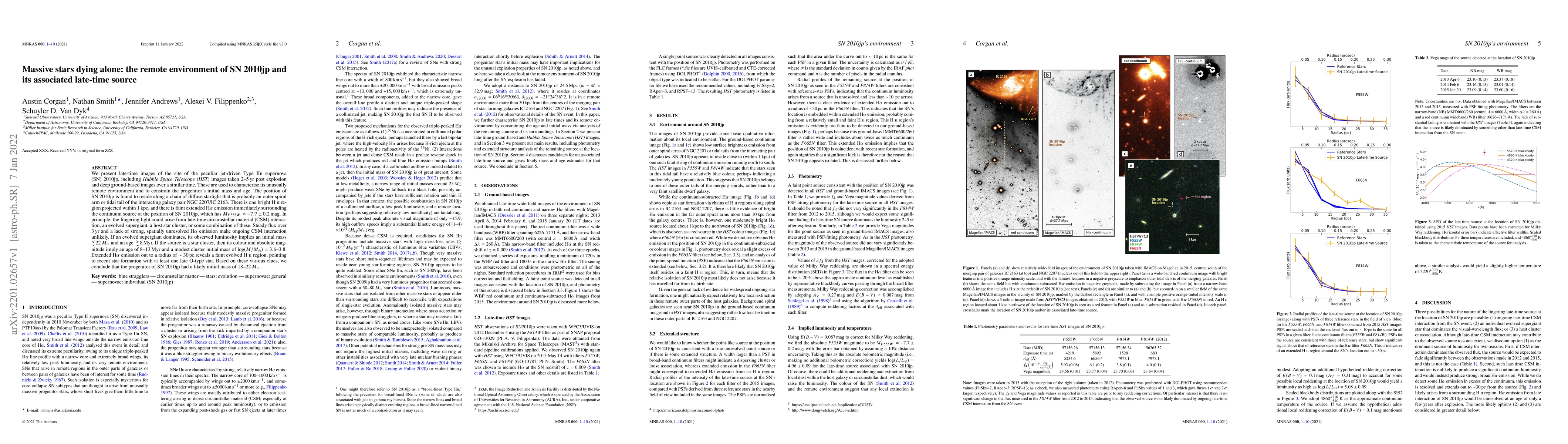We present late-time images of the site of the peculiar jet-driven TypeIIn supernova SN2010jp, including HST images taken 2-5 yr post explosion and deep ground-based images over a similar time. These are used to characterise its unusually remote environment and to constrain the progenitor's initial mass and age. The position of SN2010jp is found to reside along a chain of diffuse starlight that is probably an outer spiral arm or tidal tail of the interacting galaxy pair NGC2207/IC2163. There is one bright HII region projected within 1 kpc, and there is faint extended Halpha emission immediately surrounding the continuum source at the position of SN2010jp, which has $M_{F555W} = -7.7 (\pm 0.2)$ mag. In principle, the lingering light could arise from late-time circumstellar material (CSM) interaction, an evolved supergiant, a host star cluster, or some combination of these. Steady flux over 3 yr and a lack of strong, spatially unresolved Halpha emission make ongoing CSM interaction unlikely. If an evolved supergiant dominates, its observed luminosity implies an initial mass of roughly 22 $M_{\odot}$ and an age older than roughly 8 Myr. If the source is a star cluster, then its colour and absolute magnitude imply an age of 8-13 Myr and a modest cluster initial mass of log($M/M_{\odot}$) = 3.6-3.8. Extended Halpha emission out to a radius of 30 pc reveals a faint evolved HII region, pointing to recent star formation with at least one late O-type star. Based on these various clues, we conclude that the progenitor of SN2010jp had a likely initial mass of 18-22 $M_{\odot}$.