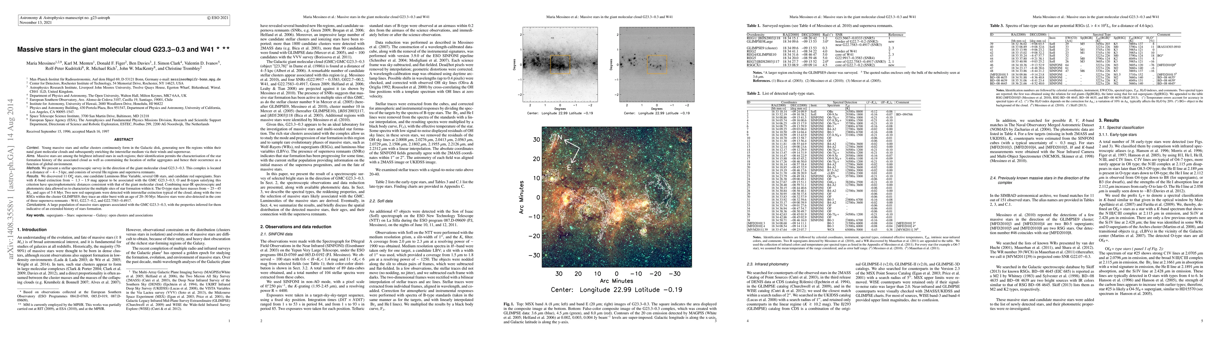 This paper presents a spectroscopic survey of the giant molecular cloud G23.3-0.3, identifying numerous massive stars including OfK+ stars, OB stars, and red supergiants, indicating an extended history of star formation. Additionally, massive stars were found in the cores of supernova remnants within W41, suggesting ongoing stellar formation in these regions.