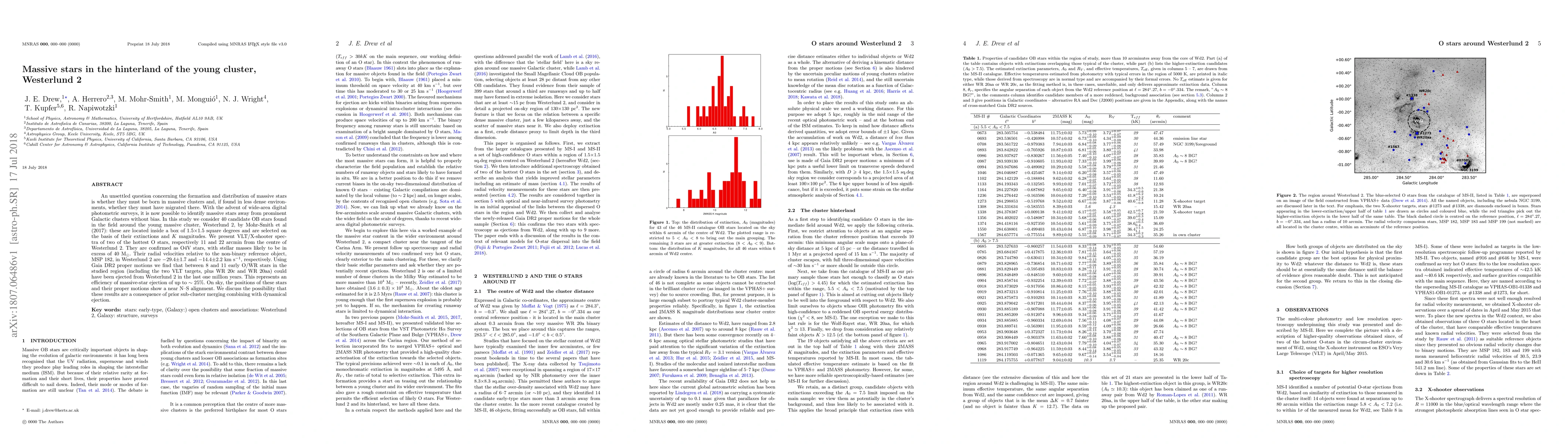 An unsettled question concerning the formation and distribution of massive stars is whether they must be born in massive clusters and, if found in less dense environments, whether they must have migrated there. With the advent of wide-area digital photometric surveys, it is now possible to identify massive stars away from prominent Galactic clusters without bias. In this study we consider 40 candidate OB stars found in the field around the young massive cluster, Westerlund 2, by Mohr-Smith et al (2017): these are located inside a box of 1.5x1.5 square degrees and are selected on the basis of their extinctions and K magnitudes. We present VLT/X-shooter spectra of two of the hottest O stars, respectively 11 and 22 arcmin from the centre of Westerlund 2. They are confirmed as O4V stars, with stellar masses likely to be in excess of 40 Msun. Their radial velocities relative to the non-binary reference object, MSP 182, in Westerlund 2 are -29.4 +/- 1.7 and -14.4 +/- 2.2 km/s, respectively. Using Gaia DR2 proper motions we find that between 8 and 11 early O/WR stars in the studied region (including the two VLT targets, plus WR 20c and WR 20aa) could have been ejected from Westerlund 2 in the last one million years. This represents an efficiency of massive-star ejection of up to 25%. On sky, the positions of these stars and their proper motions show a near N--S alignment. We discuss the possibility that these results are a consequence of prior sub-cluster merging combining with dynamical ejection.