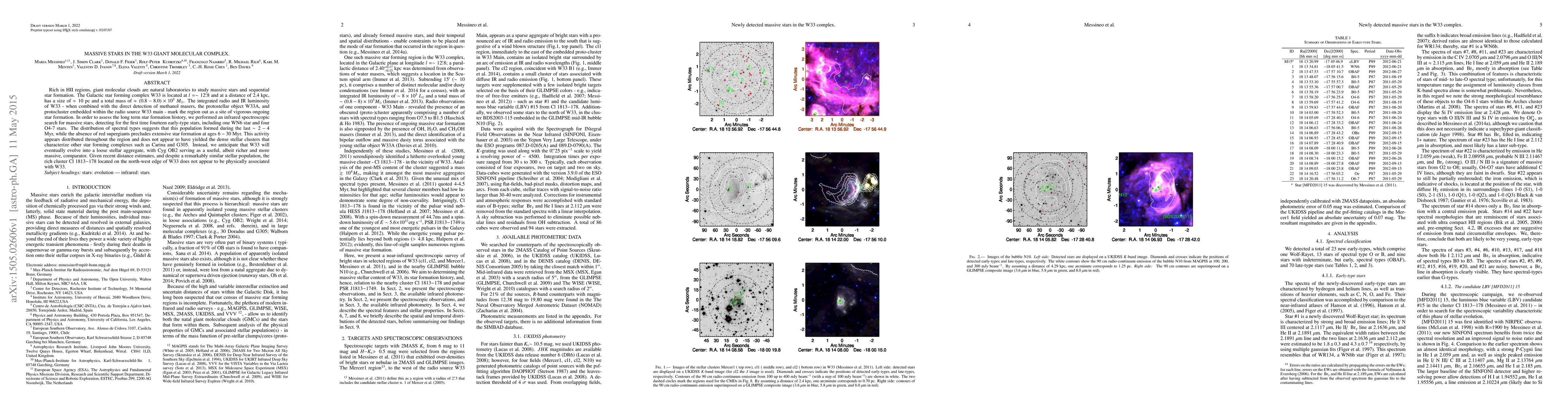 Rich in HII regions, giant molecular clouds are natural laboratories to study massive stars and sequential star formation. The Galactic star forming complex W33 is located at l=~12.8deg and at a distance of 2.4 kpc, has a size of ~10 pc and a total mass of (~0.8 - ~8.0) X 10^5 Msun. The integrated radio and IR luminosity of W33 - when combined with the direct detection of methanol masers, the protostellar object W33A, and protocluster embedded within the radio source W33 main - mark the region out as a site of vigorous ongoing star formation. In order to assess the long term star formation history, we performed an infrared spectroscopic search for massive stars, detecting for the first time fourteen early-type stars, including one WN6 star and four O4-7 stars. The distribution of spectral types suggests that this population formed during the last ~2-4 Myr, while the absence of red supergiants precludes extensive star formation at ages 6-30 Myr. This activity appears distributed throughout the region and does not appear to have yielded the dense stellar clusters that characterize other star forming complexes such as Carina and G305. Instead, we anticipate that W33 will eventually evolve into a loose stellar aggregate, with Cyg OB2 serving as a useful, albeit richer and more massive, comparator. Given recent distance estimates, and despite a remarkably similar stellar population, the rich cluster Cl 1813-178 located on the north-west edge of W33 does not appear to be physically associated with W33.