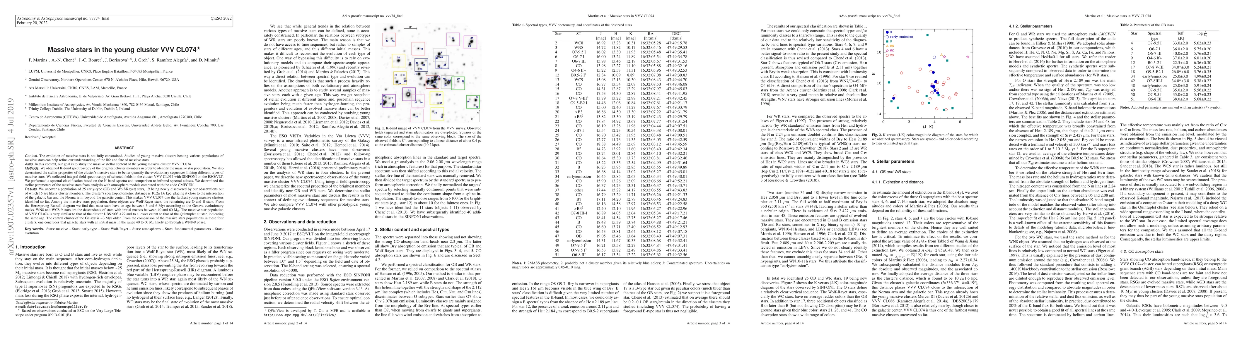 We obtained K-band spectroscopy of the brightest members of the cluster VVV CL074 in order to identify the massive star population. We also determined the stellar properties of the cluster's massive stars to better quantify the evolutionary sequences linking different types of massive stars. We collected integral field spectroscopy of selected fields in the cluster VVV CL074 with SINFONI on the ESO/VLT. We performed a spectral classification based on the K-band spectra and comparison to infrared spectral atlases. We determined the stellar parameters of the massive stars from analysis with atmosphere models computed with the code CMFGEN. We uncover a population of 25 early-type (OB and Wolf-Rayet) stars, 19 being newly discovered by our observations out of which 15 are likely cluster members. The cluster's spectrophotometric distance is 10.2+/-1.6 kpc, placing it close to the intersection of the galactic bar and the Norma arm, beyond the galactic center. This makes VVV CL074 one the farthest young massive clusters identified so far. Among the massive stars population, three objects are Wolf-Rayet stars, the remaining are O and B stars. From the Hertzsprung-Russell diagram we find that most stars have an age between 3 and 6 Myr according to the Geneva evolutionary tracks. WN8 and WC8-9 stars are the descendants of stars with initial masses between 40 and 60 Msun. The massive star population of VVV CL074 is very similar to that of the cluster DBS2003-179 and to a lesser extent to that of the Quintuplet cluster, indicating the same age. The central cluster of the Galaxy is ~3 Myr older. From the comparison of the massive stars populations in these four clusters, one concludes that galactic stars with an initial mass in the range 40 to 60 Msun likely go through a WN8-9 phase.
