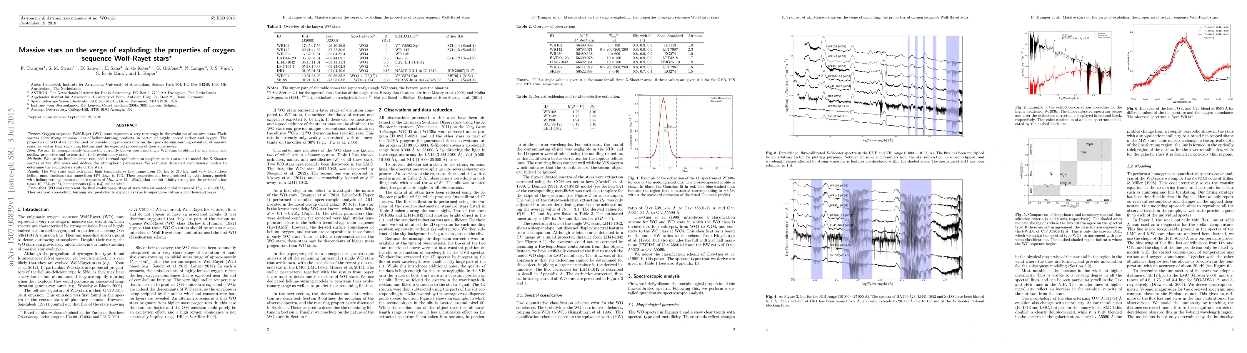 Context. Oxygen sequence Wolf-Rayet (WO) stars represent a very rare stage in the evolution of massive stars. Their spectra show strong emission lines of helium-burning products, in particular highly ionized carbon and oxygen. The properties of WO stars can be used to provide unique constraints on the (post-)helium burning evolution of massive stars, as well as their remaining lifetime and the expected properties of their supernovae. Aims. We aim to homogeneously analyse the currently known presumed-single WO stars to obtain the key stellar and outflow properties and to constrain their evolutionary state. Methods. We use the line-blanketed non-local thermal equilibrium atmosphere code cmfgen to model the X-Shooter spectra of the WO stars and deduce the atmospheric parameters. We calculate dedicated evolutionary models to determine the evolutionary state of the stars. Results. The WO stars have extremely high temperatures that range from 150 kK to 210 kK, and very low surface helium mass fractions that range from 44% down to 14%. Their properties can be reproduced by evolutionary models with helium zero-age main sequence masses of $M_{\mathrm{He, ini}} = 15-25 M_{\odot}$ that exhibit a fairly strong (on the order of a few times $10^{-5} M_{\odot} \mathrm{yr}^{-1}$), homogeneous ($f_\mathrm{c} > 0.3$) stellar wind. Conclusions. WO stars represent the final evolutionary stage of stars with estimated initial masses of $M_{\mathrm{ini}} = 40-60 M_{\odot}$. They are post core-helium burning and predicted to explode as type Ic supernovae within a few thousand years.