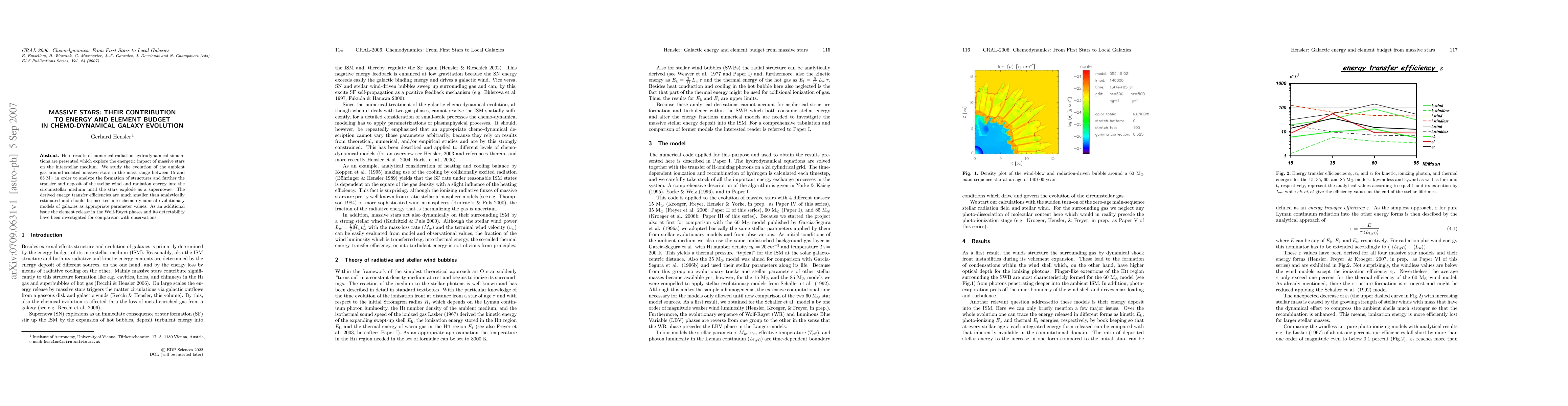 Here results of numerical radiation hydrodynamical simulations are presented which explore the energetic impact of massive stars on the interstellar medium. We study the evolution of the ambient gas around isolated massive stars in the mass range between 15 and 85 Msun in order to analyze the formation of structures and further the transfer and deposit of the stellar wind and radiation energy into the circumstellar medium until the stars explode as a supernovae. The derived energy transfer efficiencies are much smaller than analytically estimated and should be inserted into chemo-dynamical evolutionary models of galaxies as appropriate parameter values. As an additional issue the element release in the Wolf-Rayet phases and its detectability have been investigated for comparison with observations.