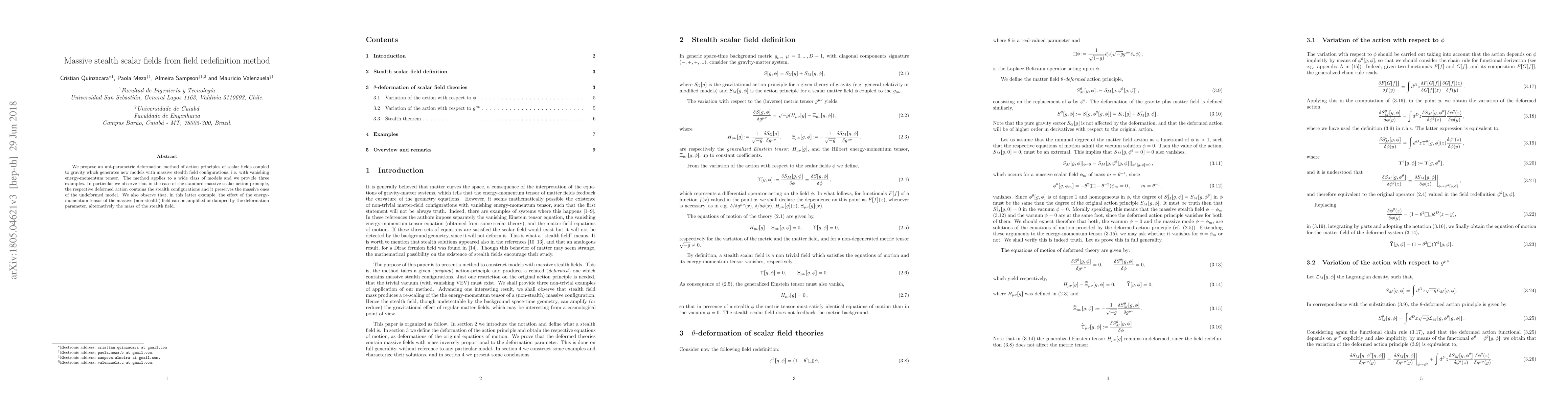 We propose an uni-parametric deformation method of action principles of scalar fields coupled to gravity which generates new models with massive stealth field configurations, i.e. with vanishing energy-momentum tensor. The method applies to a wide class of models and we provide three examples. In particular we observe that in the case of the standard massive scalar action principle, the respective deformed action contains the stealth configurations and it preserves the massive ones of the undeformed model. We also observe that, in this latter example, the effect of the energy-momentum tensor of the massive (non-stealth) field can be amplified or damped by the deformation parameter, alternatively the mass of the stealth field.
