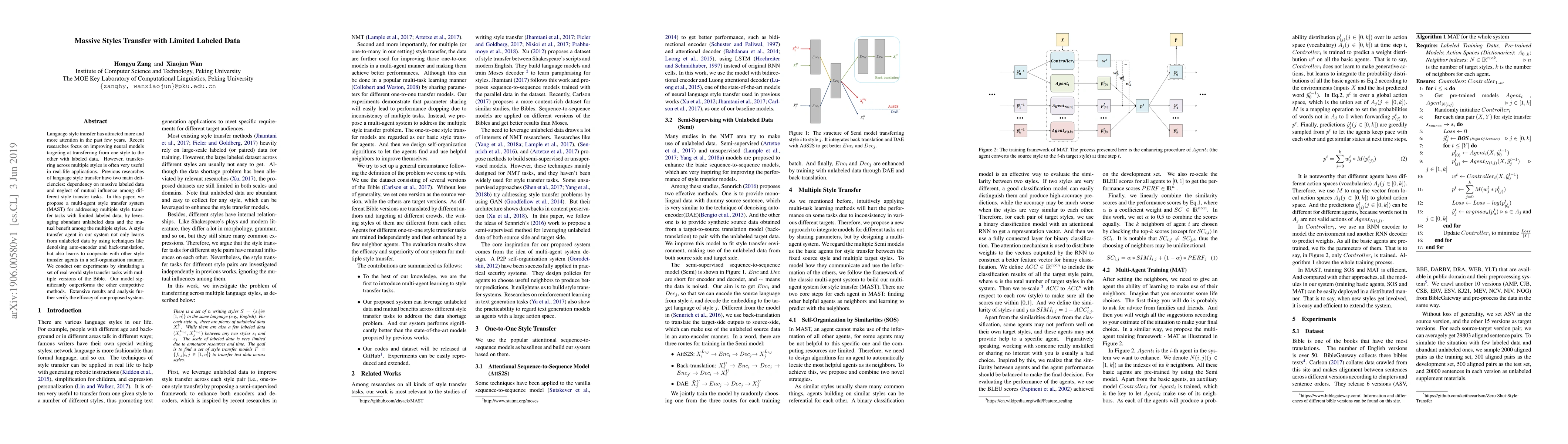 This paper introduces a multi-agent style transfer system (MAST) to address multiple style transfer tasks with limited labeled data, leveraging unlabeled data and mutual cooperation among agents. The proposed system significantly outperforms other methods in real-world style transfer tasks, as demonstrated through experiments using multiple versions of the Bible.