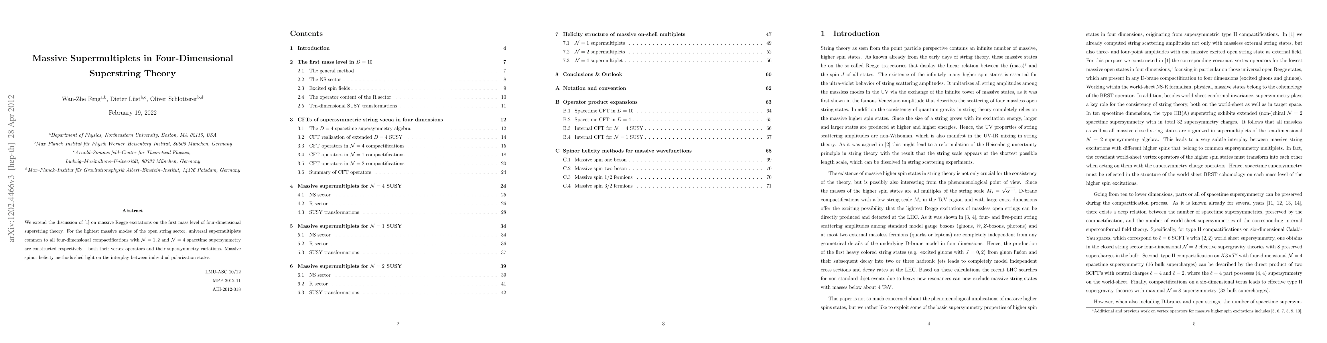 We extend the discussion of arXiv:1007.5254 on massive Regge excitations on the first mass level of four-dimensional superstring theory. For the lightest massive modes of the open string sector, universal supermultiplets common to all four-dimensional compactifications with N = 1, 2 and N = 4 spacetime supersymmetry are constructed respectively -- both their vertex operators and their supersymmetry variations. Massive spinor helicity methods shed light on the interplay between individual polarization states.