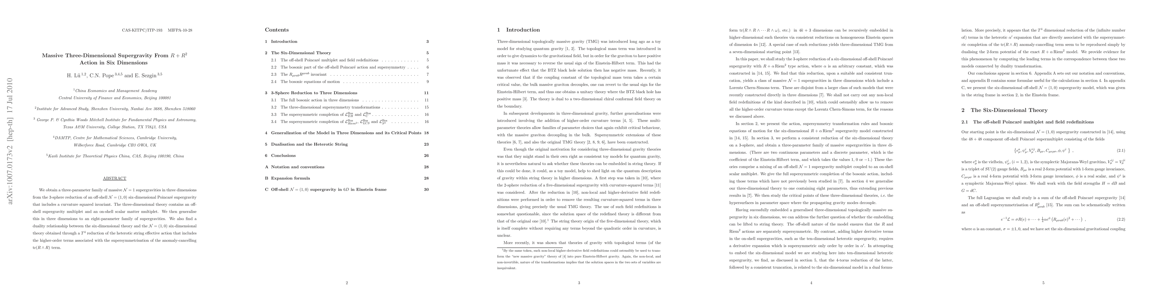 This research derives a three-parameter massive N=1 supergravity in three dimensions from a six-dimensional reduction, and extends it to an eight-parameter family. It also identifies a duality between the six-dimensional supergravity and the heterotic string effective action in six dimensions.