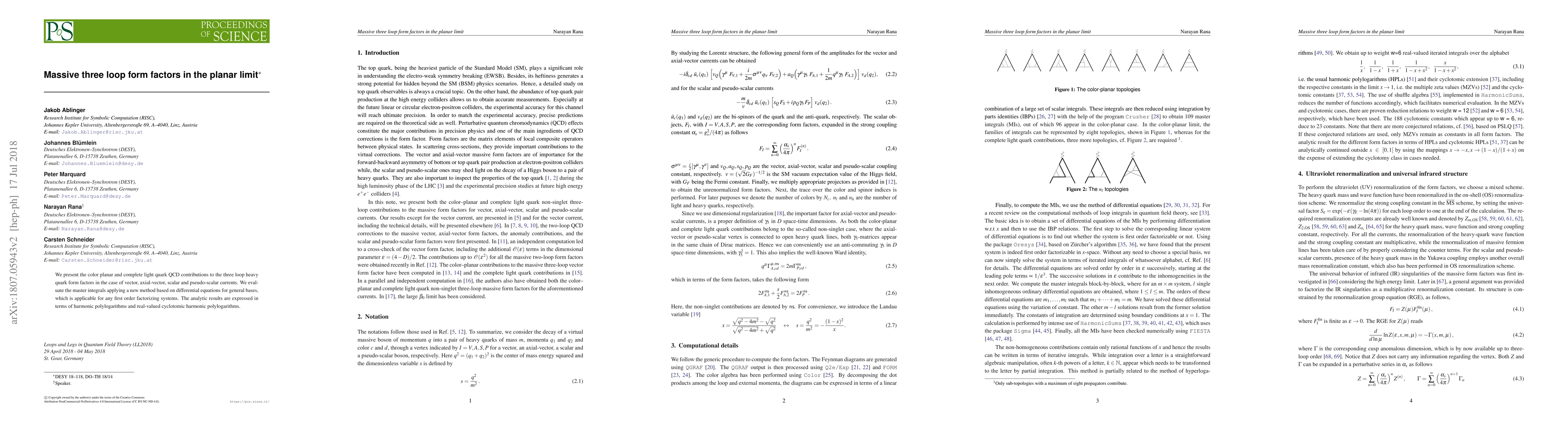 We present the color planar and complete light quark QCD contributions to the three loop heavy quark form factors in the case of vector, axial-vector, scalar and pseudo-scalar currents. We evaluate the master integrals applying a new method based on differential equations for general bases, which is applicable for any first order factorizing systems. The analytic results are expressed in terms of harmonic polylogarithms and real-valued cyclotomic harmonic polylogarithms.
