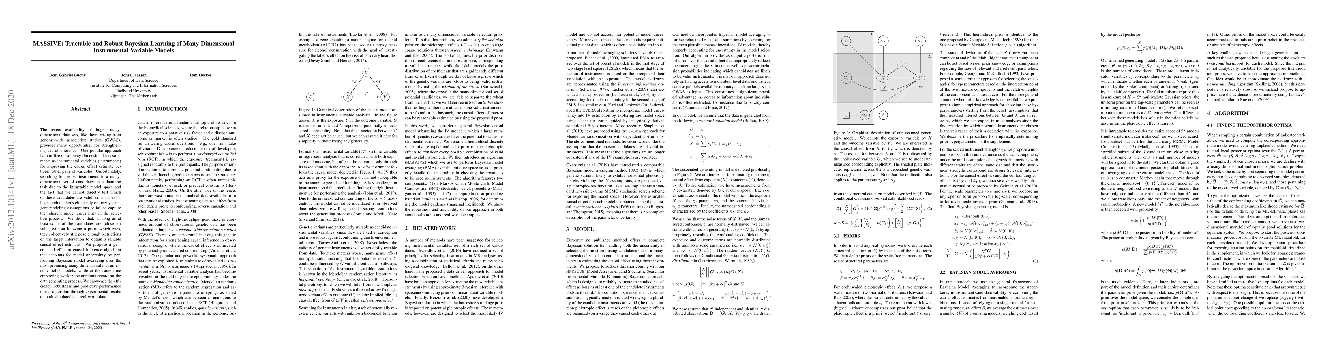 The paper introduces MASSIVE, a Bayesian learning algorithm for causal inference using many-dimensional instrumental variable models. It addresses the challenge of identifying valid instruments from large candidate sets by performing model averaging, reducing reliance on strict assumptions about data generation, and ensuring robust and efficient causal effect estimation in genome-wide association studies and other domains.