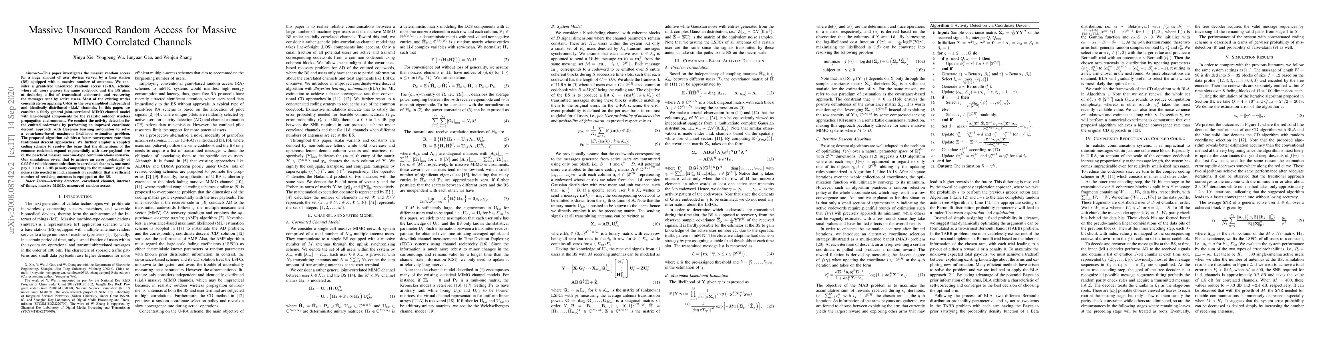 This paper investigates the massive random access for a huge amount of user devices served by a base station (BS) equipped with a massive number of antennas. We consider a grant-free unsourced random access (U-RA) scheme where all users possess the same codebook and the BS aims at declaring a list of transmitted codewords and recovering the messages sent by active users. Most of the existing works concentrate on applying U-RA in the oversimplified independent and identically distributed (i.i.d.) channels. In this paper, we consider a fairly general joint-correlated MIMO channel model with line-of-sight components for the realistic outdoor wireless propagation environments. We conduct the activity detection for the emitted codewords by performing an improved coordinate descent approach with Bayesian learning automaton to solve a covariance-based maximum likelihood estimation problem. The proposed algorithm exhibits a faster convergence rate than traditional descent approaches. We further employ a coupled coding scheme to resolve the issue that the dimensions of the common codebook expand exponentially with user payload size in the practical massive machine-type communications scenario. Our simulations reveal that to achieve an error probability of 0.05 for reliable communications in correlated channels, one must pay a 0.9 to 1.3 dB penalty comparing to the minimum signal to noise ratio needed in i.i.d. channels on condition that a sufficient number of receiving antennas is equipped at the BS.